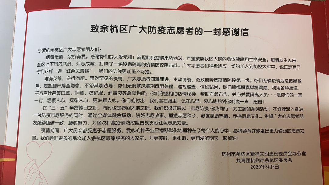 3月5日,宗保公司驻周浦市容项目收到周浦镇瓦屑居委会送来的表扬信,表扬废寝忘食、临危不惧、昼夜奋战在疫情防控一线的队员。