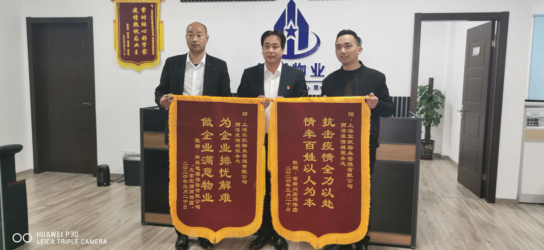 两面锦旗既是对公司驻两港装饰城员工们工作的肯定,又是对大家的鞭策和激励。公司驻两港装饰城员工们将不负众望,再接再厉,开展精细化管理,提供优质化服务;将与全体业主一道并肩作战,共同做好疫情防控,为业主健康平安保驾护航。