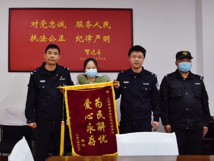 报警人蒋媛媛和朋友当即拿出现金感谢民警和宗保队员,被婉言谢绝。3月16号下午,报警人专程到张江派出所赠送一面锦旗表示感谢。