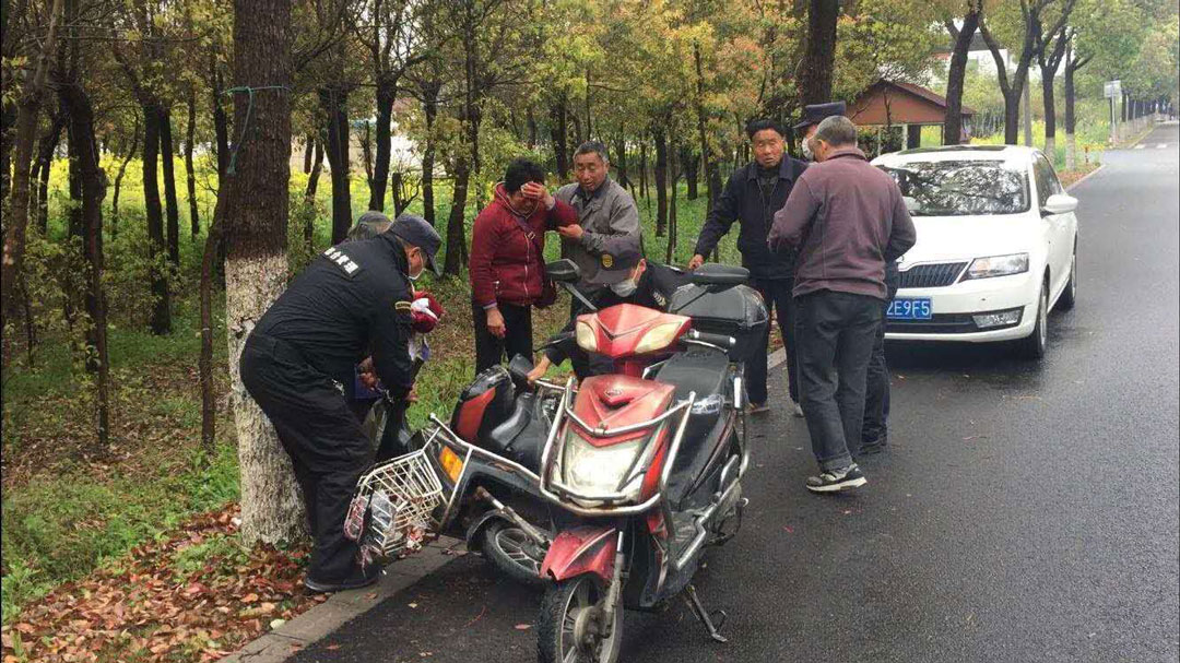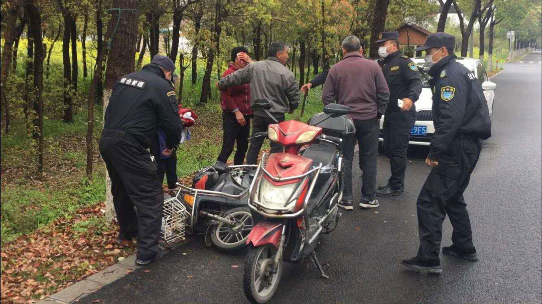 3月28日11:20,刚下过雨路面湿滑。宗保公司驻金山卫市容项目张建华、孙传奇、王振鹏、李凯、李昆鹏等队员在去上班的路上,看到一位老人摔倒在马路边,电动车压在老人身上。该老人额头有些擦伤,手捂着额头一时间无法起身。