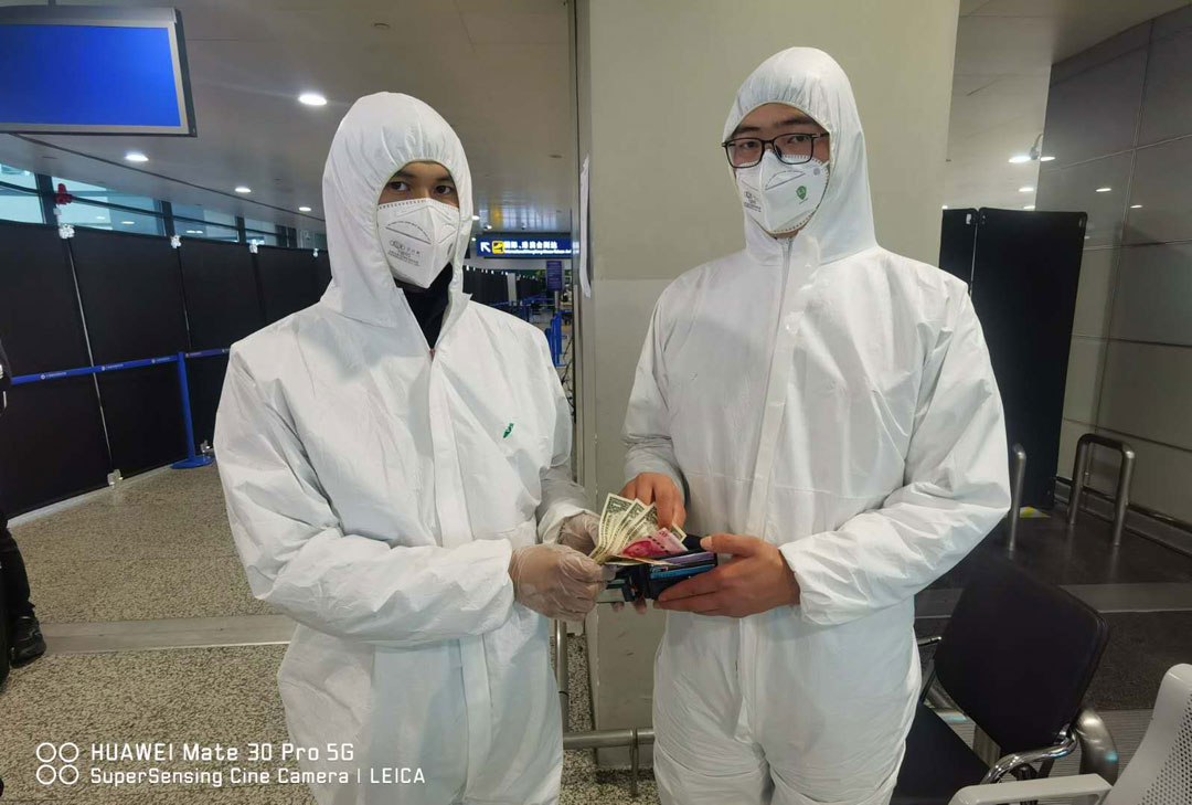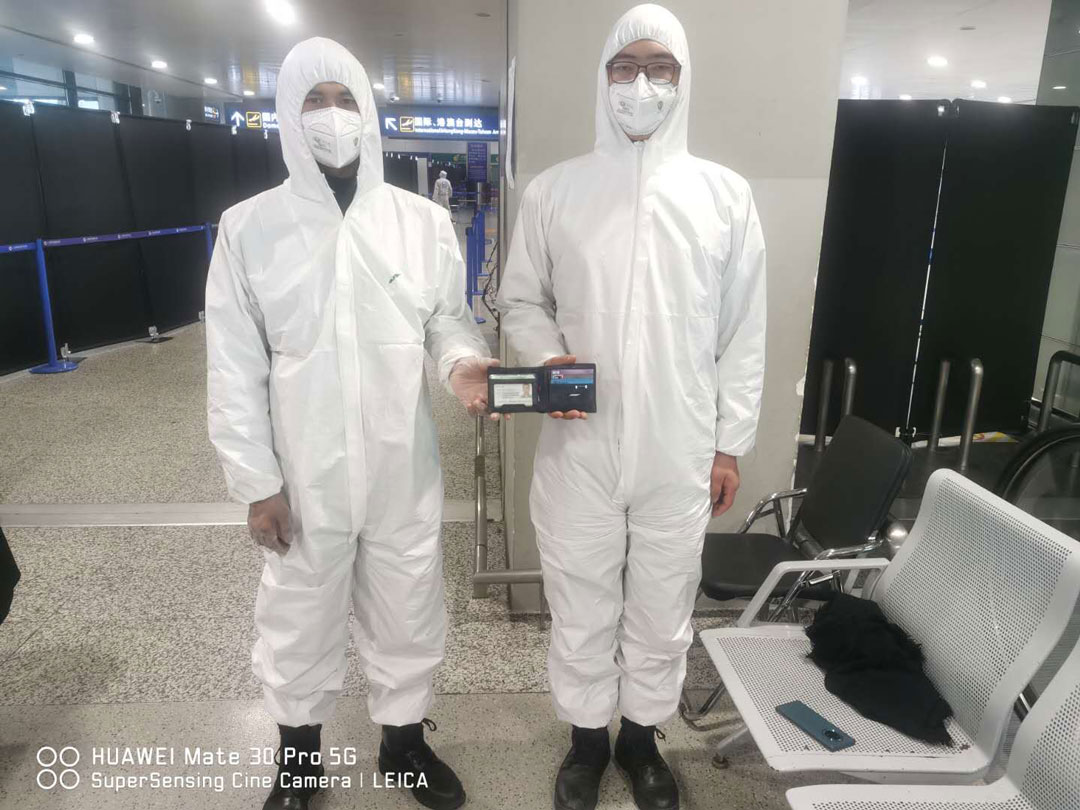 3月26日,宗保公司驻浦东国际机场口岸疫情防控一线的队员郭文龙、王岩森在执勤的过程中,捡到一个钱包。钱包内装有美金、人民币、身份证以及10余张银行卡等。