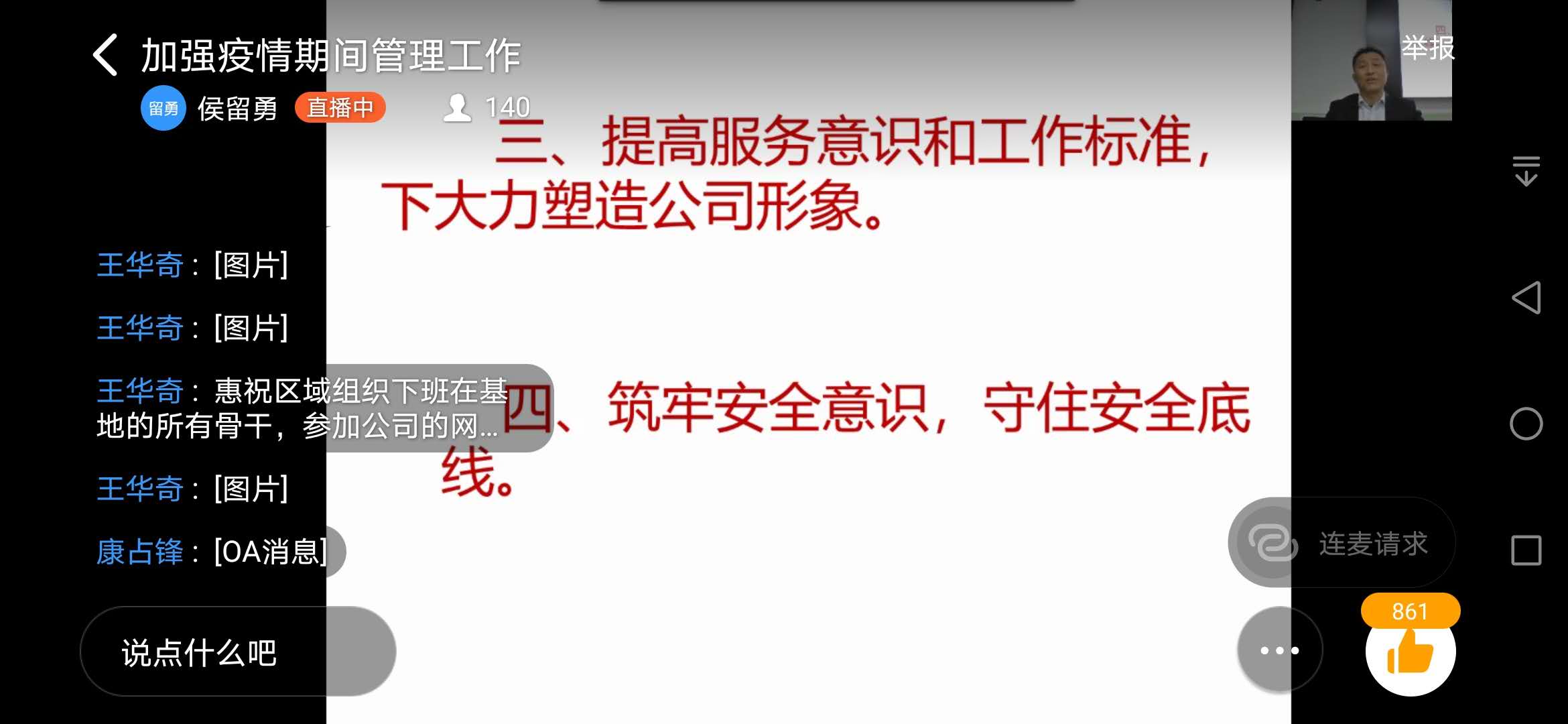 4月3日18点,宗保公司副总经理侯留勇通过钉钉软件就《如何抓好疫情期间的管理工作》进行线上授课,上海区域、杭州区域、黄山区域的150多名骨干同步听课。