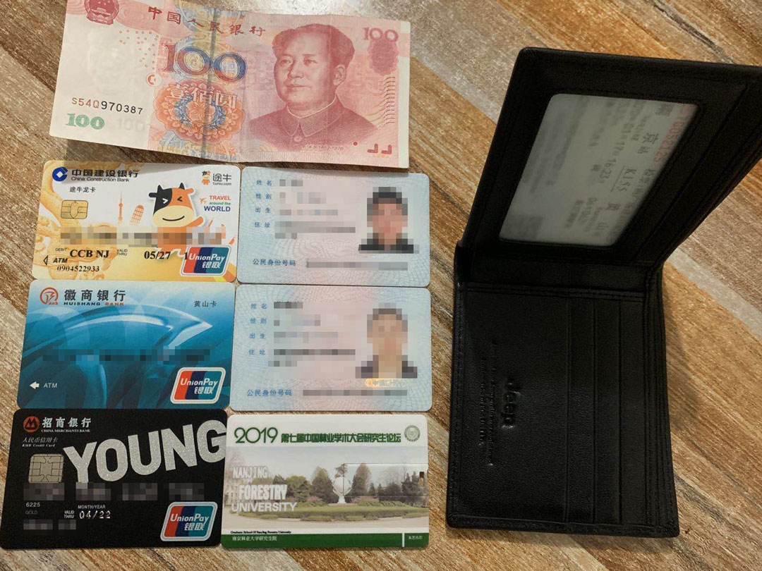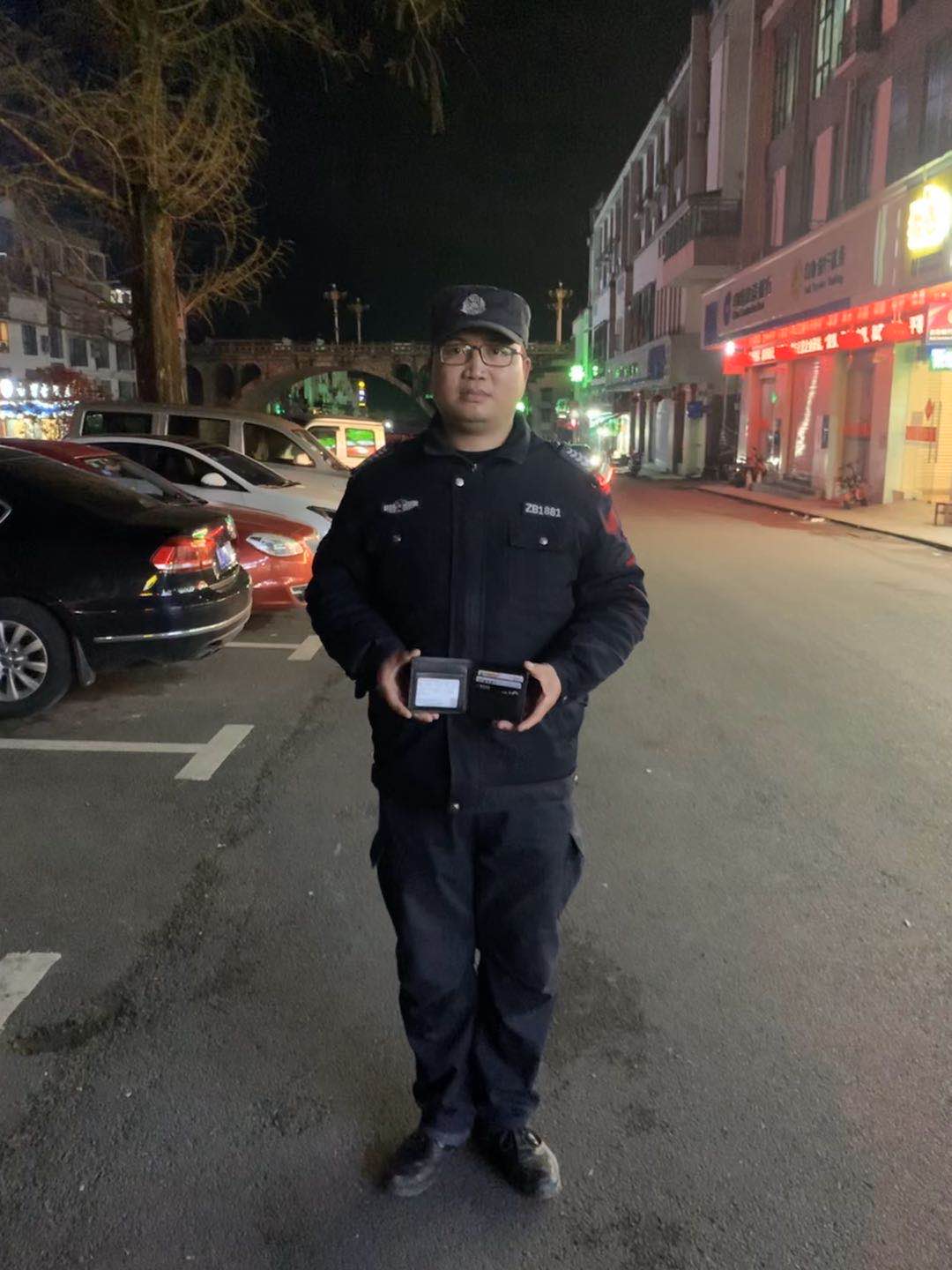 4月1号20:00,宗保公司驻黄山区域汤口市容项目队员杨兴智在汤口镇沿溪东街巡逻时捡到一个钱包,内有一百元现金一张、银行卡三张、身份证两张。