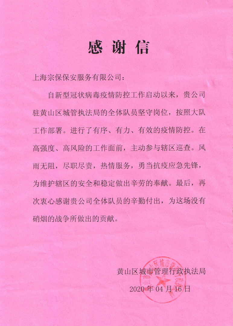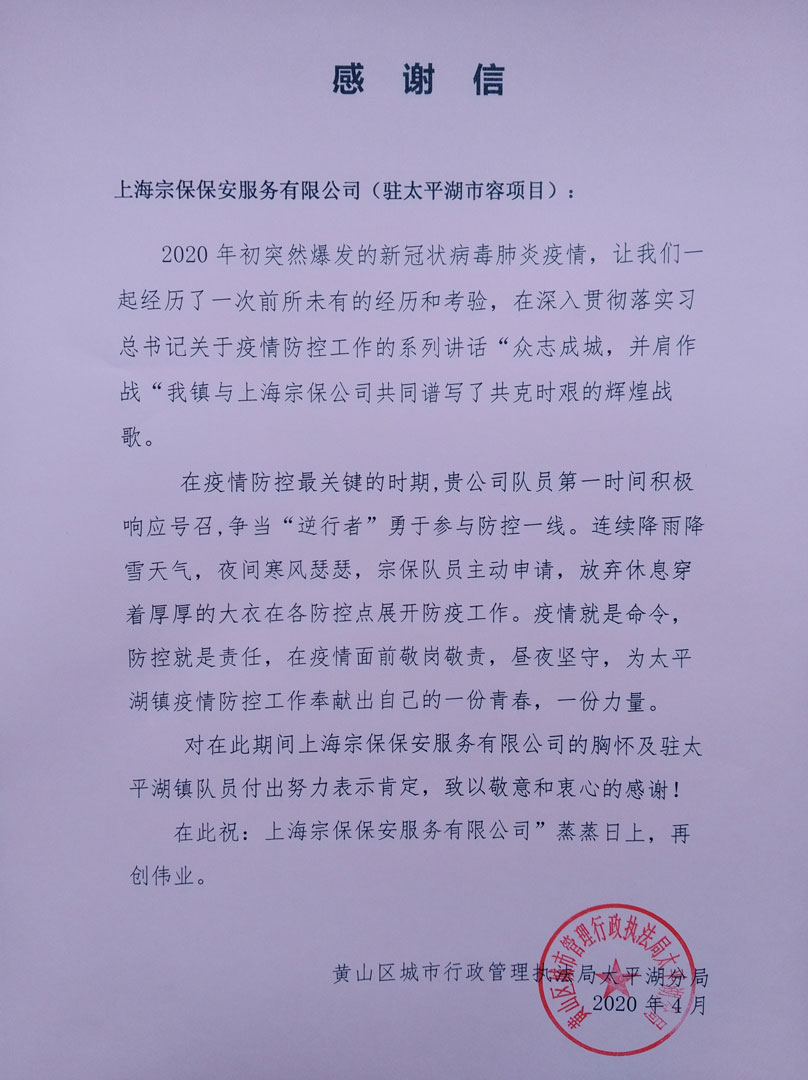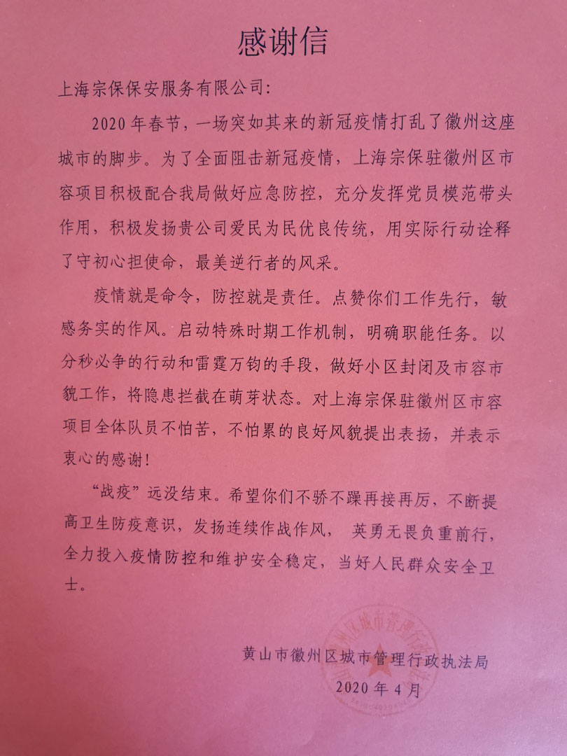 4月16日,宗保公司收到黄山区城市管理行政执法局的一封感谢信,对在疫情防控期间付出辛劳的宗保队员们表示肯定和感谢。