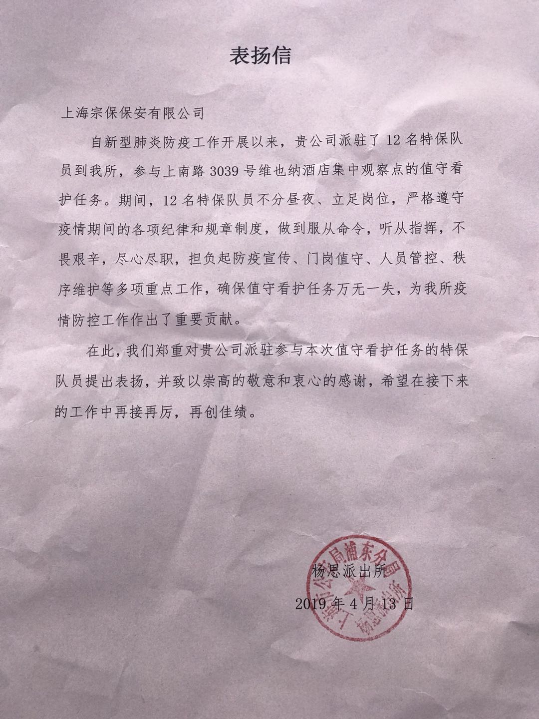 4月13日,宗保公司驻三林镇市容项目收到杨思派出所送来的一封表扬信,信中对三林镇市容项目参与XX酒店集中医学观察点值守看护任务的宗保队员提出表扬和感谢。