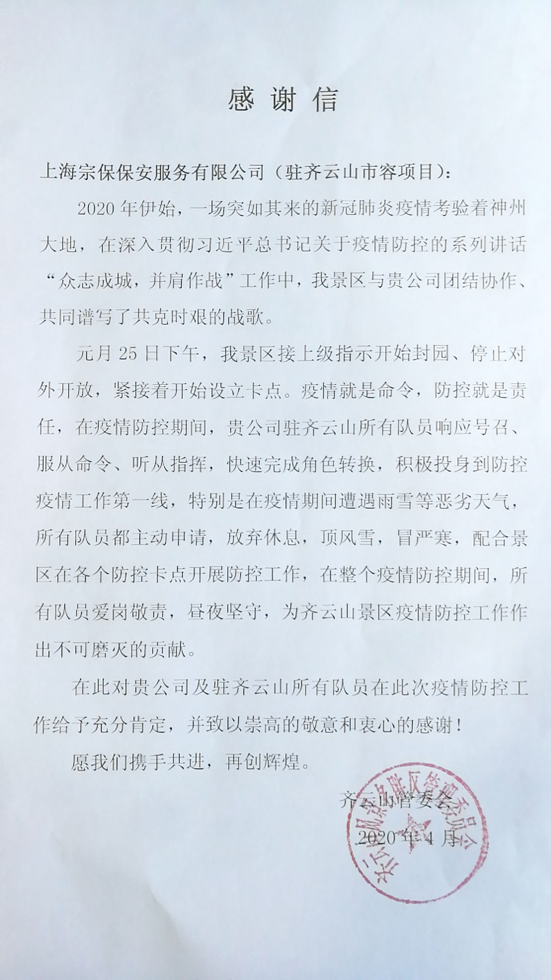 4月16日,宗保公司驻黄山区域齐云山市容项目收到齐云山管委会的一封感谢信,对在疫情防控期间付出辛劳的宗保队员们表示肯定和感谢。