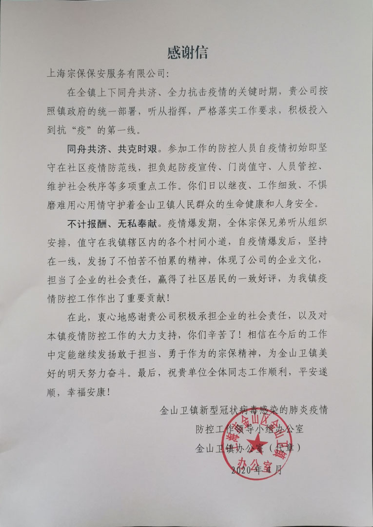 4月21日,宗保公司驻金山卫镇市容项目收到金山卫镇新冠疫情防控工作领导小组办公室和金山卫镇办公室联合发来的一封感谢信,对在疫情防控期间付出辛劳的宗保队员们表示肯定和感谢。