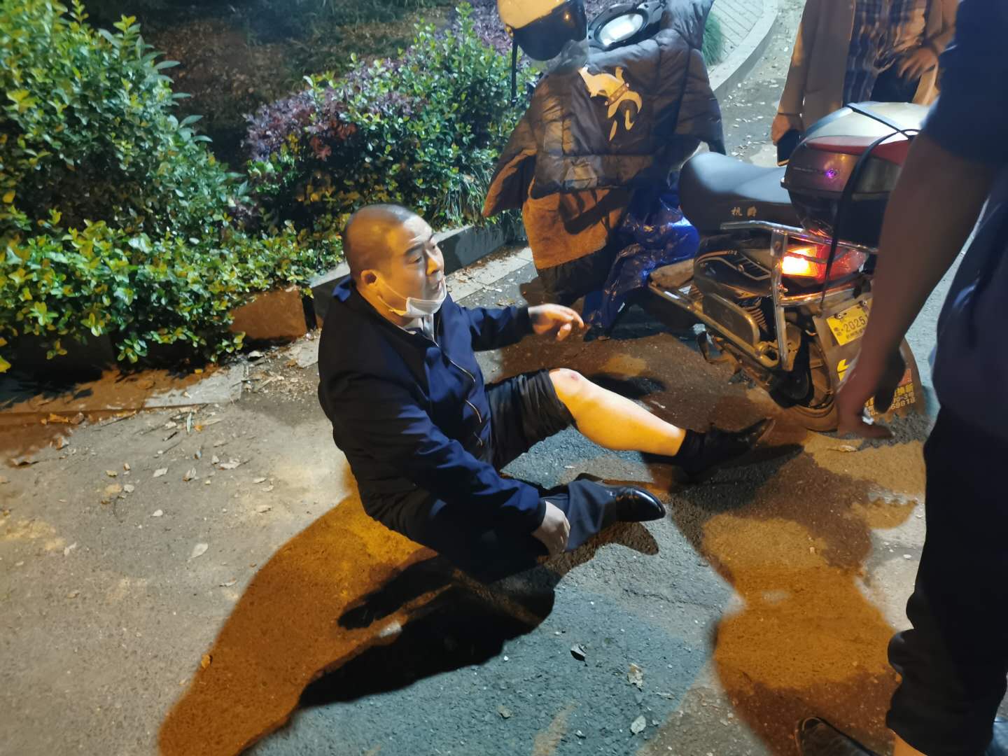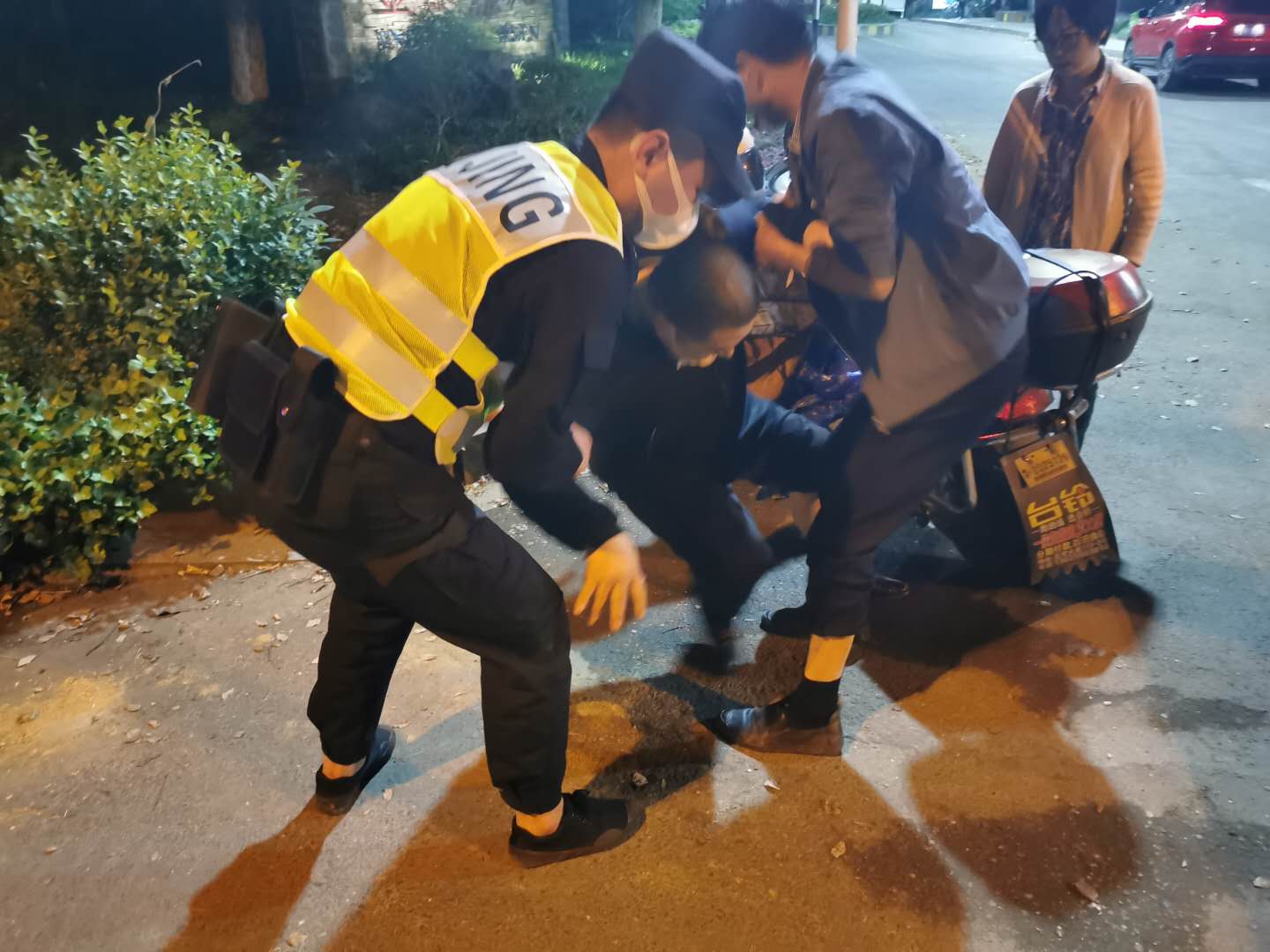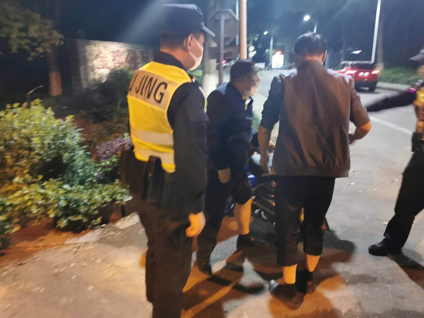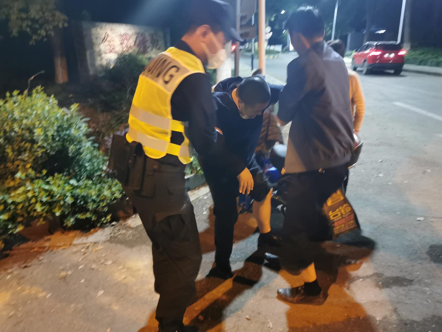 4月25日20:55,民泰公司驻闲林辅警项目队员杨有福、宋昆鹏巡逻至天目路金都雅苑小区出口时,看到一位大叔坐在地上,面露痛苦之色,旁边还有一辆倒在地上的电瓶车。两人赶紧上前,搀扶大叔起身的时候,检查发现大叔的脚不能正常用力着地,脚踝受伤严重,膝盖也有些许擦伤。