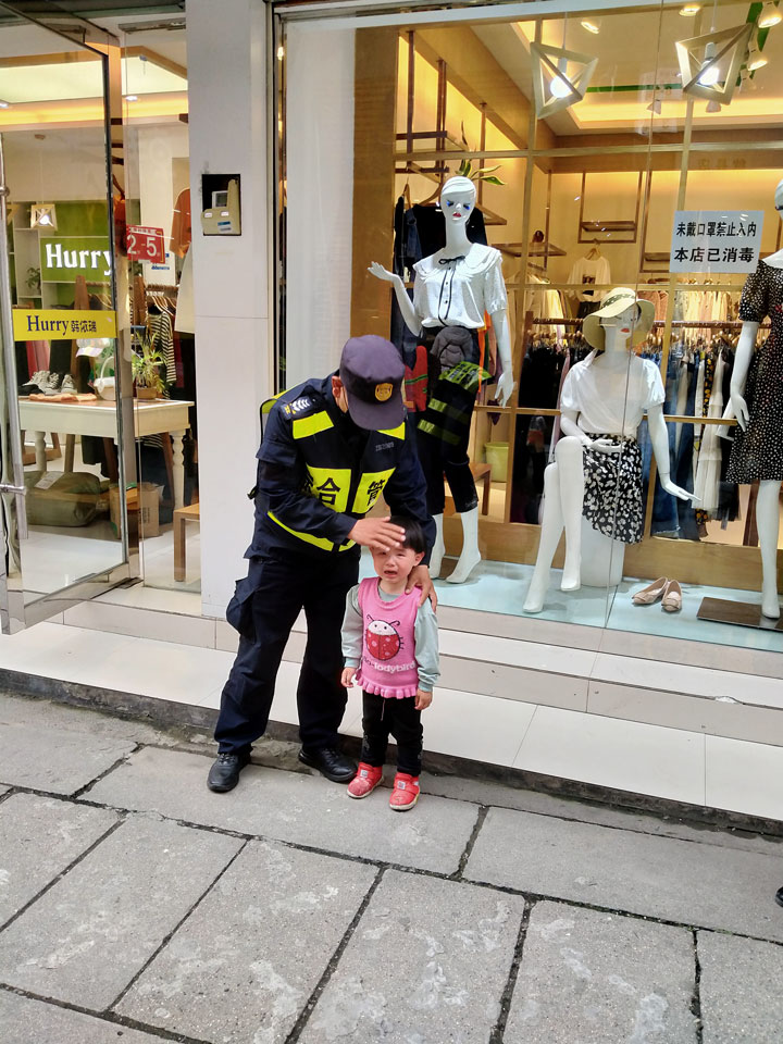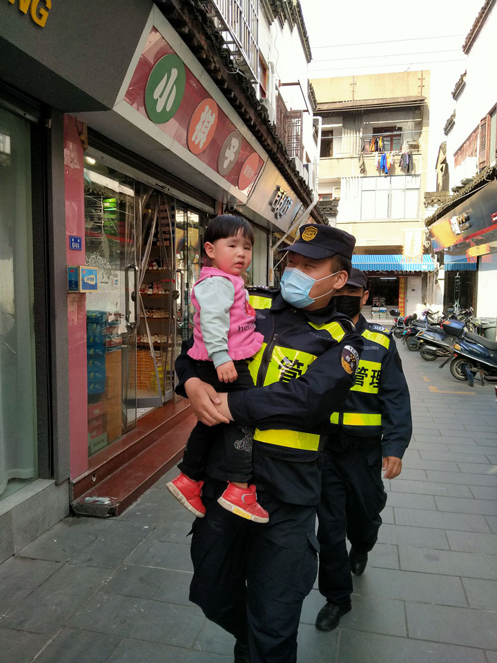 4月22日,宗保公司驻黄山歙县市容项目队员程帅强、米杨杨巡逻至古城步行街一家女装店门口时,一个小女孩的哭声引起了二人的注意,小女孩看上去大概三岁多的样子,哭着说要找奶奶。