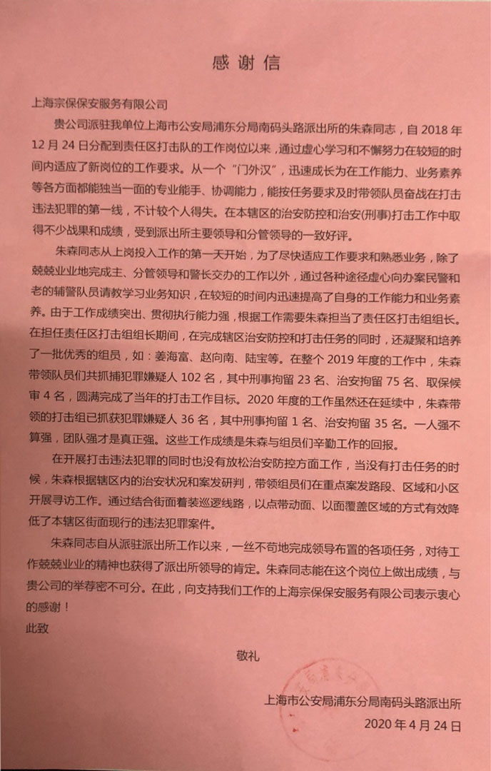 4月24日,宗保公司驻南码头派出所辅警项目收到浦东新区南码头派出所送来的感谢信,信中对该项目责任区打击组组长朱森提出特别表扬。