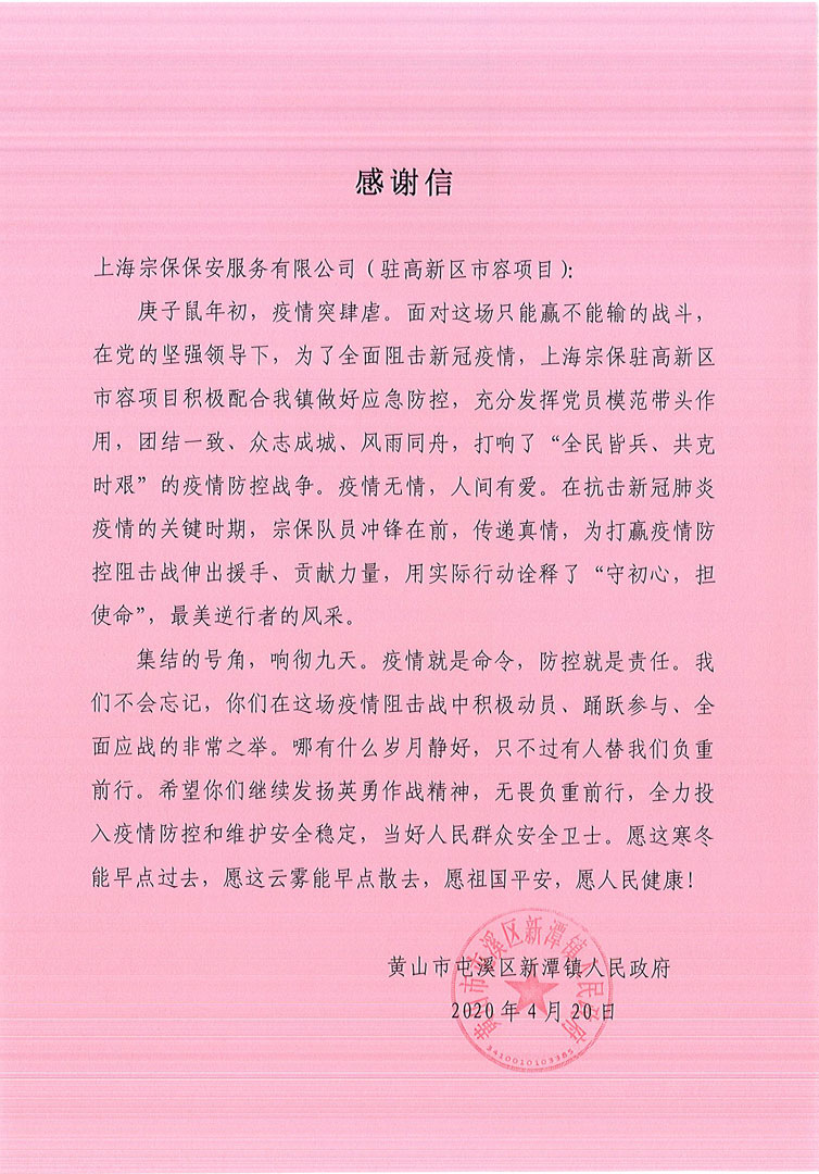 4月20日,宗保公司驻黄山市高新区市容项目收到黄山市屯溪区新潭镇人民政府送来的一封感谢信,信中对高新区市容项目全体队员在疫情防控中所做的工作表示感谢。