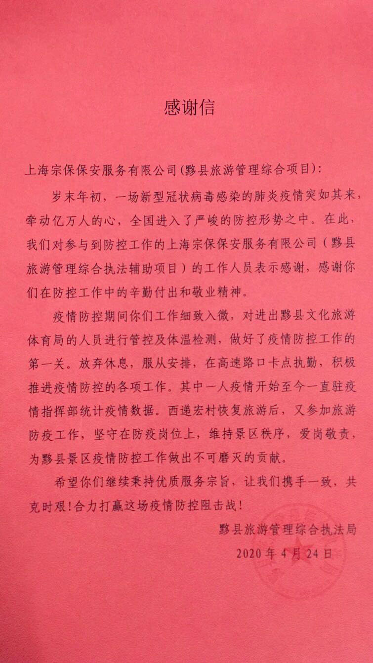4月24日,宗保公司驻黄山市黟县旅游管理综合项目收到黟县旅游管理综合执法局的一封感谢信,信中对公司全体队员在疫情防控工作中的辛勤付出和敬业精神表示感谢。