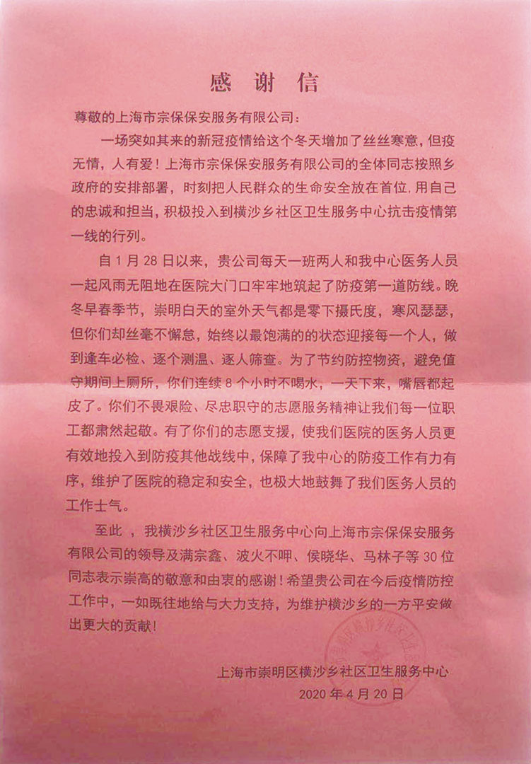 4月25日,宗保公司收到浦东新区张江镇人民政府的感谢信。信中对宗保公司以善行担起守望相助的社会责任,用义举筑起抗击疫情的家园情怀,表示感谢和敬意!