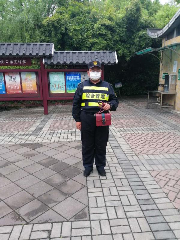 当天下午15:30左右,陈阿丽和郑世豪在高桥公园巡逻时发现草坪上有一个红色女士挎包,便走向前查看,包内有几百元现金、1张身份证、3张银行卡以及其他卡片和相关证件等物品。
