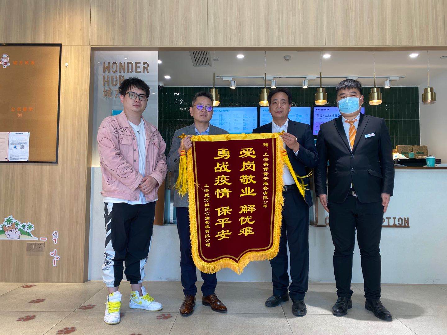 4月28日下午,上海城方城闵公寓管理有限公司总经理金义星将一面写有“爱岗敬业解忧难,勇战疫情保平安”的锦旗送到上海宗保保安服务有限公司王书剑经理的手中,这面锦旗是甲方对宗保公司疫情防控工作最好的认可和赞许。
