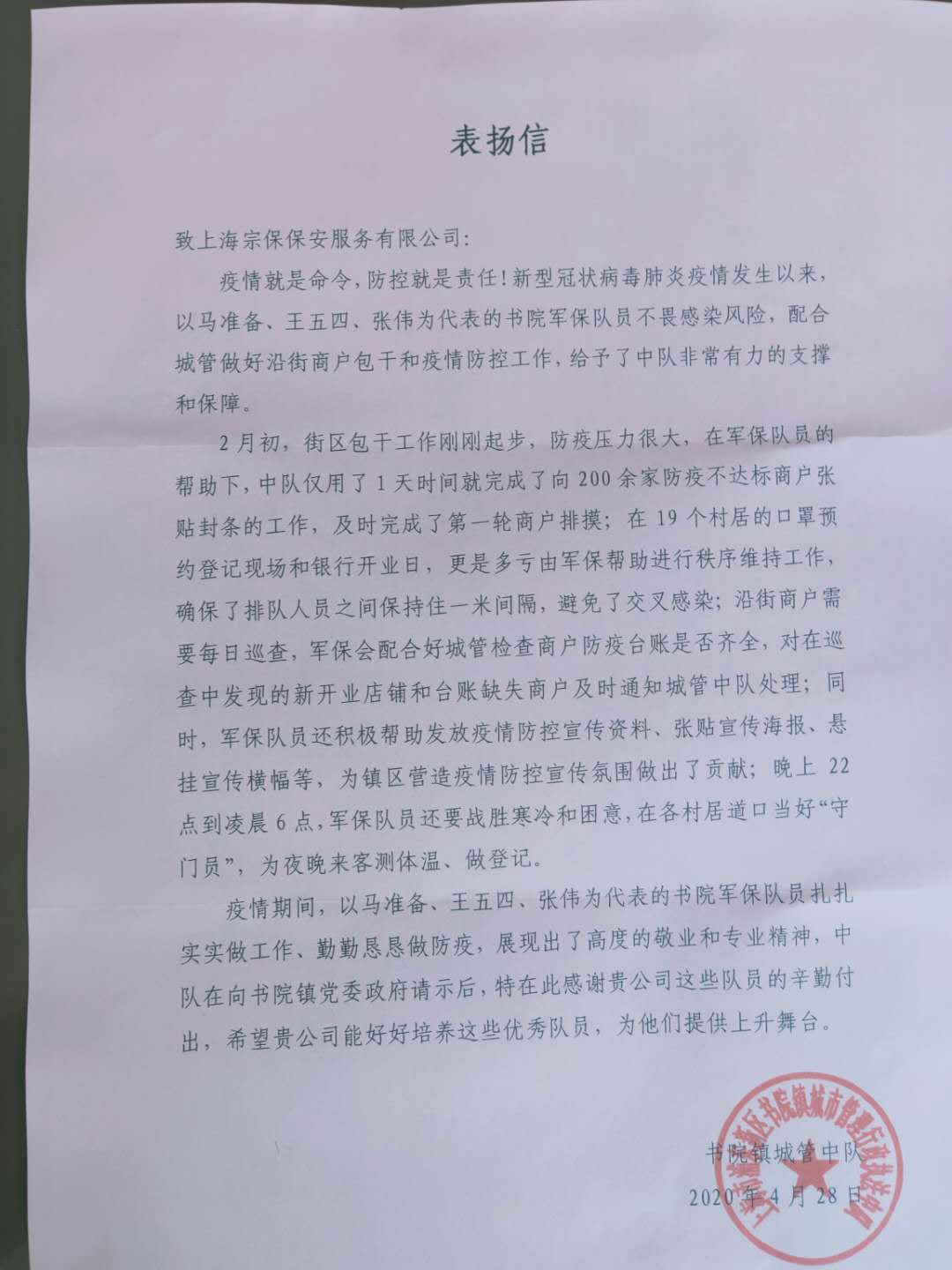 4月28日,宗保公司驻书院镇市容项目收到书院镇城管中队中队长王燕伟送来的一封表扬信,信中对以马准备、王五四、张伟等为代表的书院镇市容项目队员,在防控新冠肺炎疫情中配合城管中队所做的工作,提供的有力支撑和保障提出表扬。