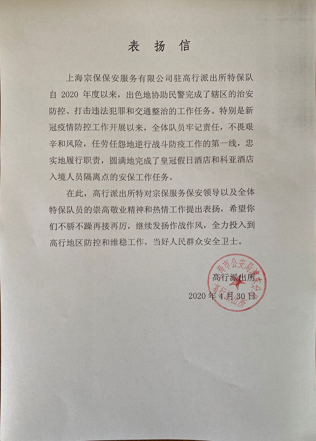 宗保公司驻高行辅警项目收到派出所表扬信