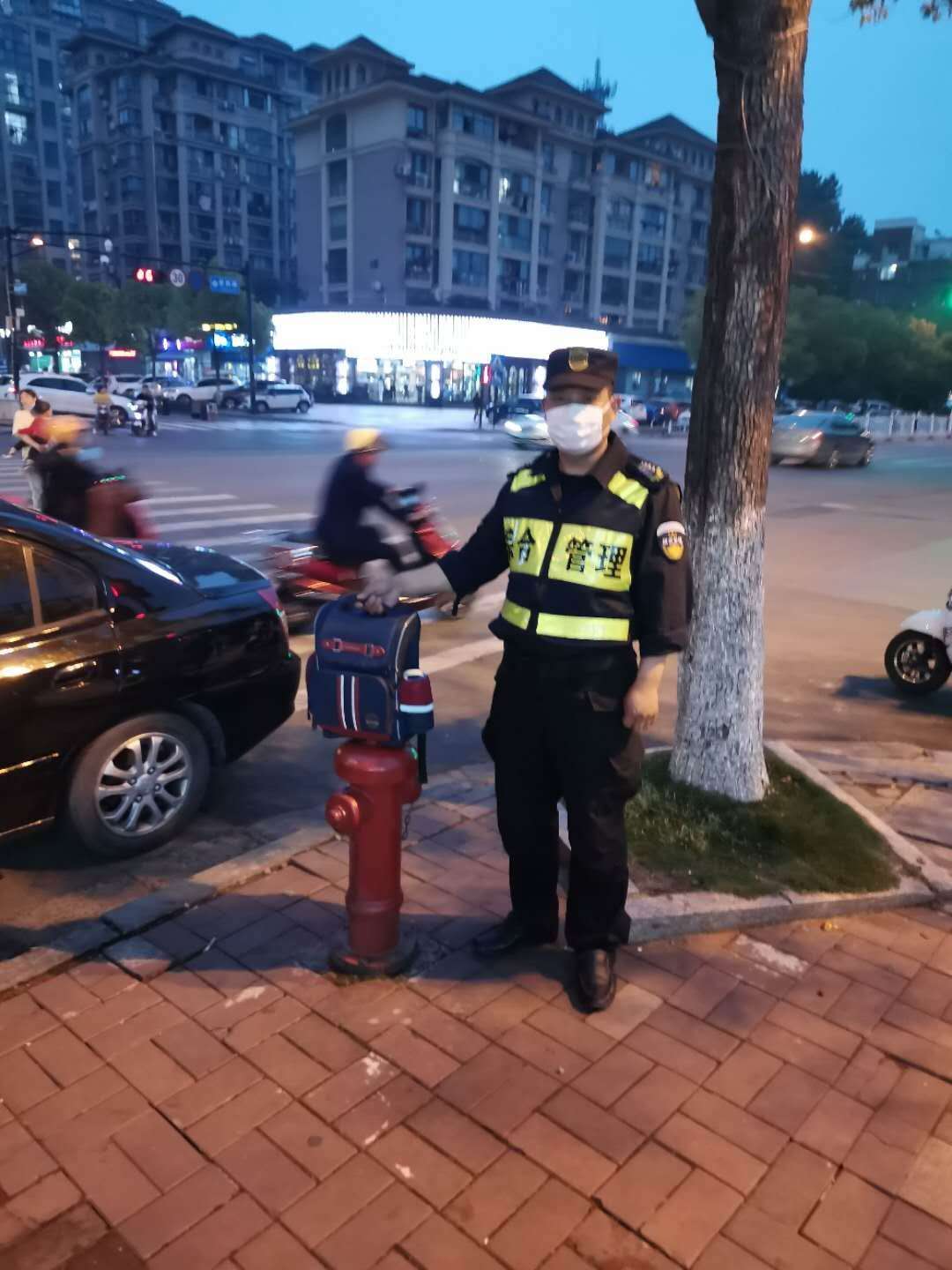 5月6日18:50,民泰公司驻星桥市容项目保安员耿俊杰在星韵路与藕花洲大街交叉口巡查时发现地上有一个书包,经过仔细检查未发现有相关联系方式。于是,耿俊杰将情况汇报给带班组长,得到指令在现场等待20分钟。