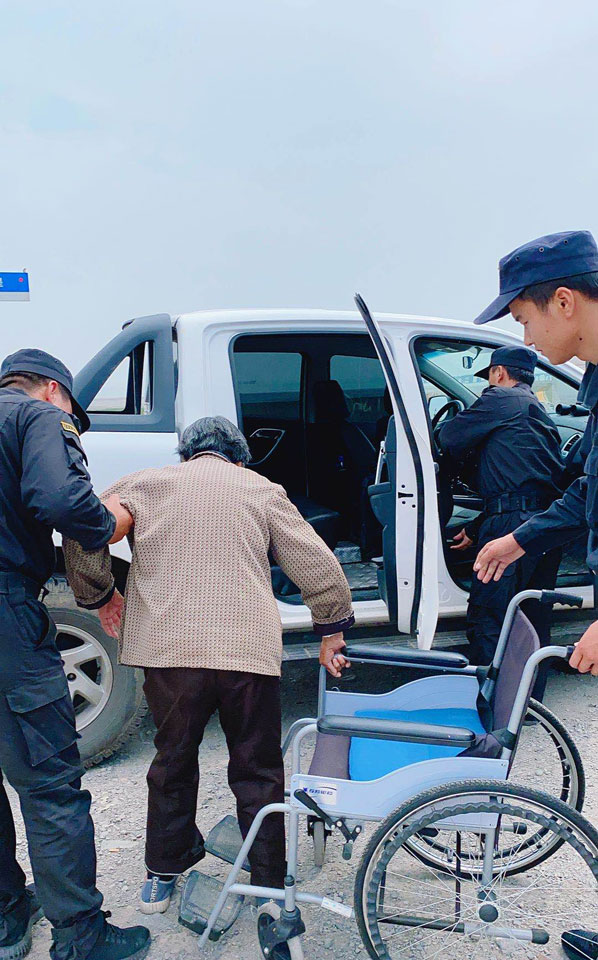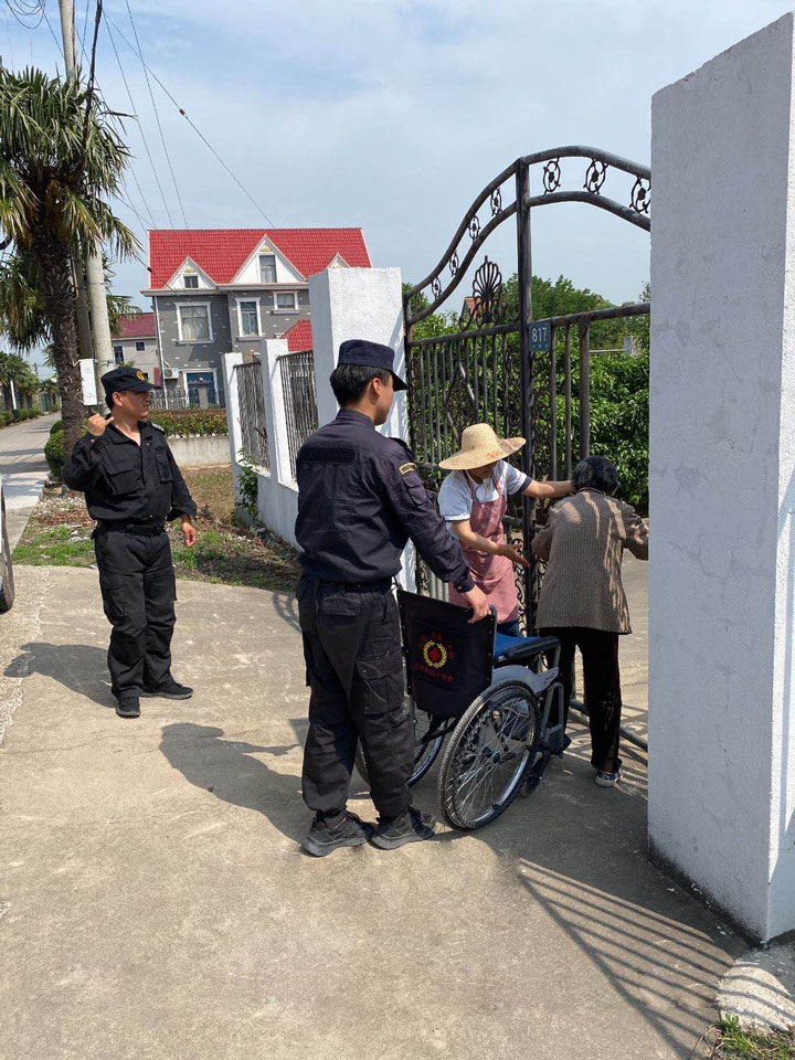 5月17日13:50,宗保公司驻崇明横沙东滩项目马成龙、马志鹏等四名队员,在巡逻途中发现一位坐着轮椅的老奶奶,东张西望,走走停停。凭借长期的工作经验,几位队员断定老奶奶可能是迷路了,而且家不会离得太远。