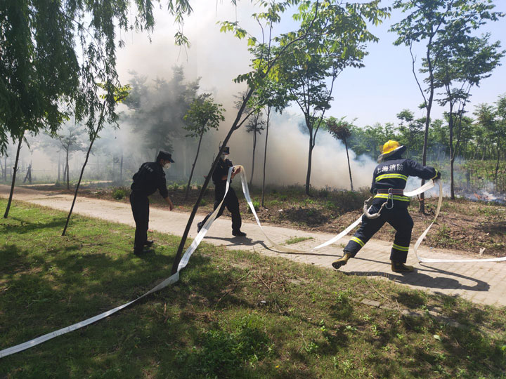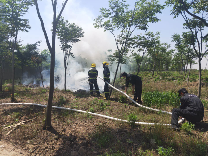 5月19日上午,宗保公司驻书院市容项目朱新雨、李兴忠两名队员巡逻至五尺沟西路路段,发现道路一侧树林着火,火势很大,浓烟滚滚。周边都是树林,火势一旦蔓延,后果不堪设想。两名队员急忙拨打119火警电话报警,并向项目副队长石健报告现场情况。石健随即安排人员到现场,疏导道路交通,做好现场安全保障。