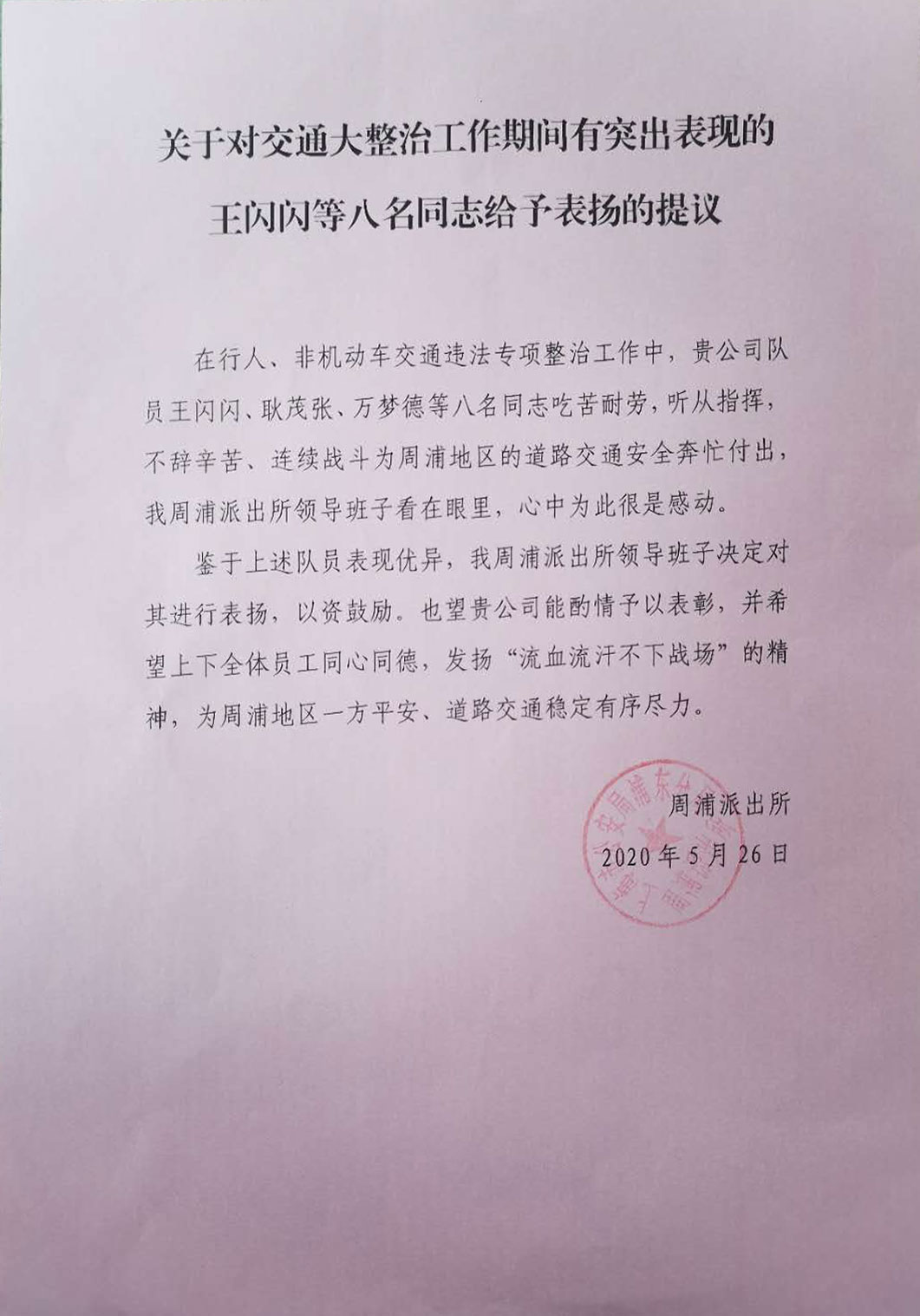 5月26日,宗保公司驻周浦派出所辅警项目收到甲方表扬信。信中对在行人、非机动车交通违法专项整治活动中,表现优秀的王闪闪、耿茂张、万梦德等八名队员提出特别表扬。