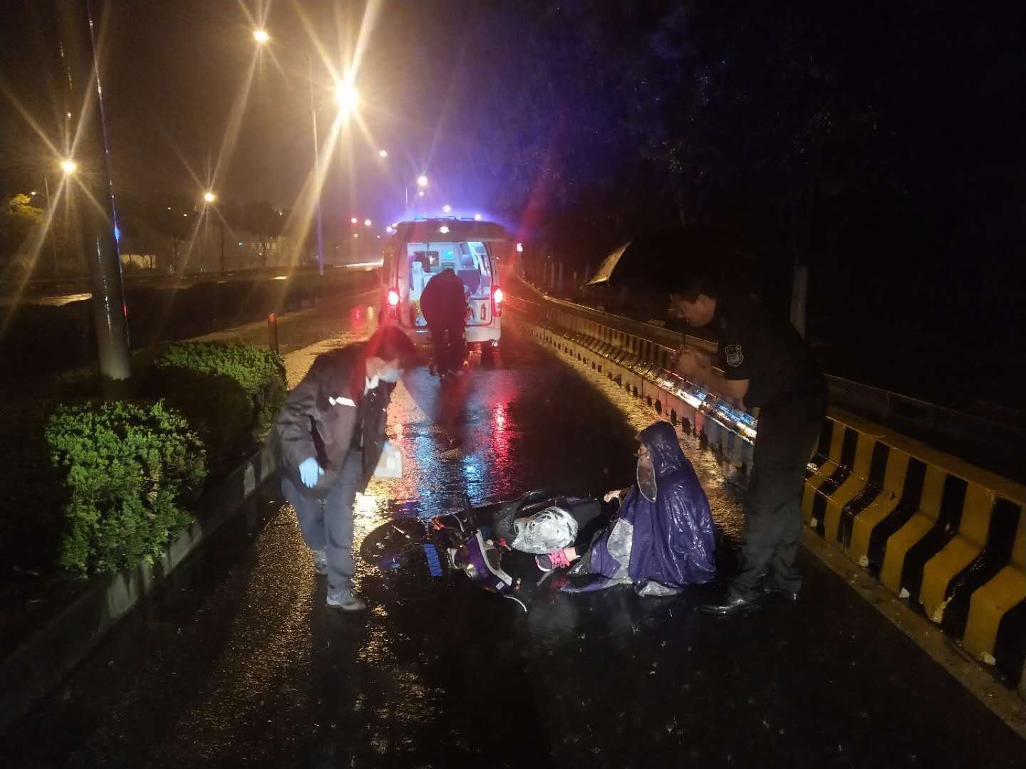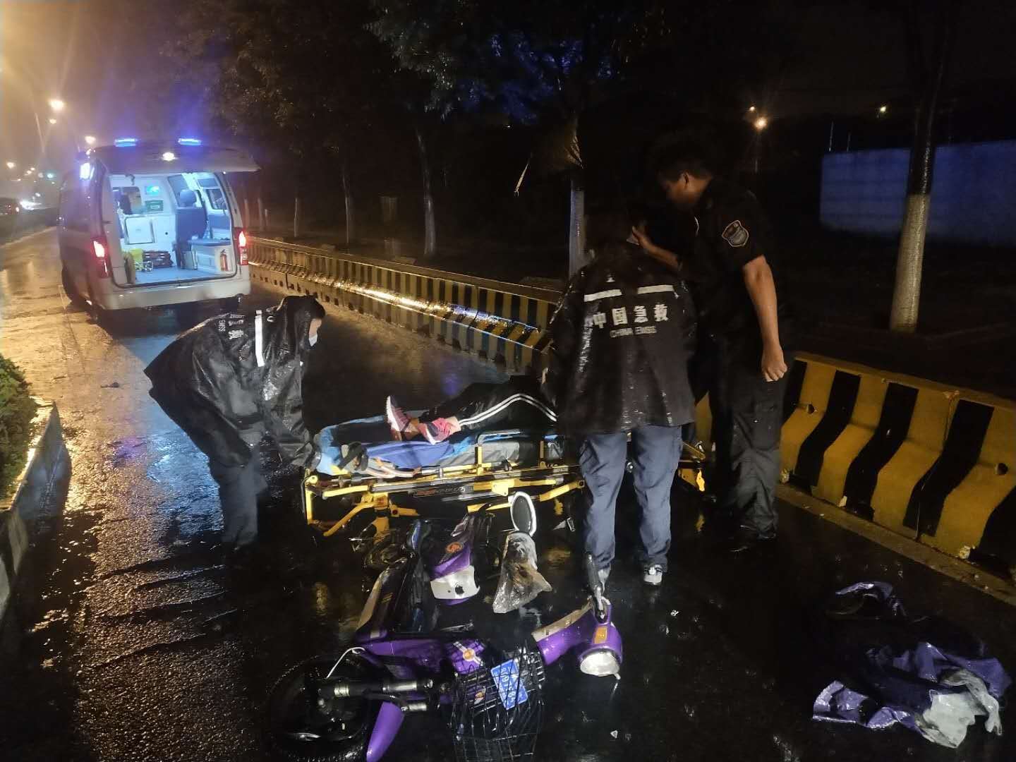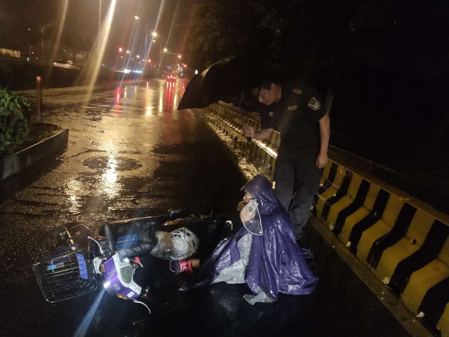 当晚22:30,大雨倾盆,能见度较差。李杰巡逻到申江路周祝公路时,发现一辆电瓶车摔倒在地,一名女子躺在雨水中无法动弹。