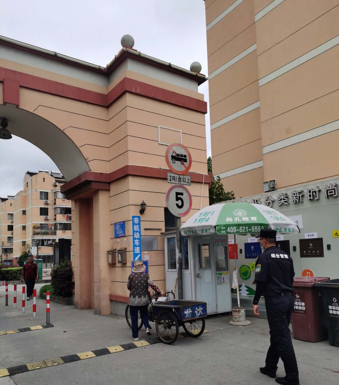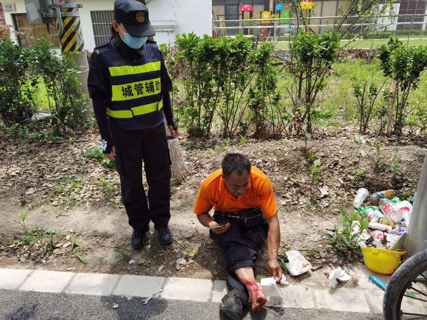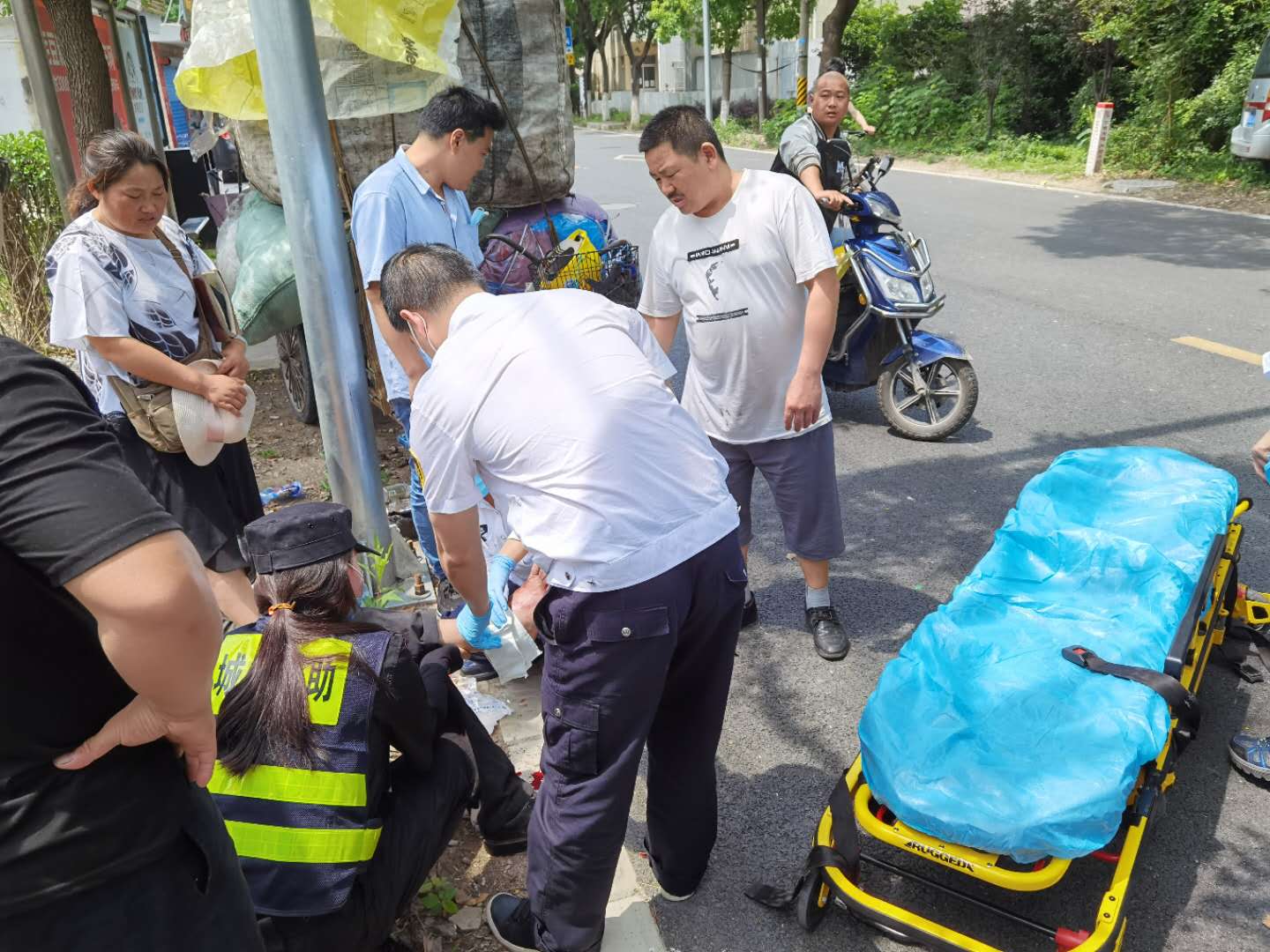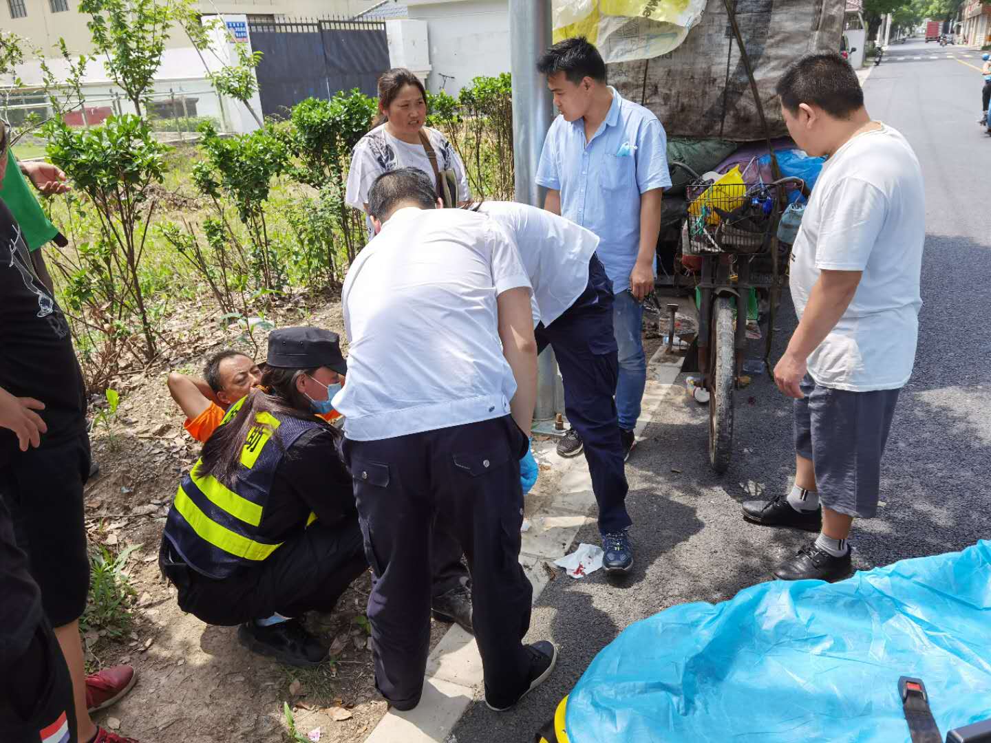 宗保公司驻周浦市容五组队员吴吉喆刚好巡逻至此,急忙上前查看,老人身体多处受伤,且伤势严重流血不止。原来是因为三轮车搭载过重,老人力气不足,无法控制车辆,才导致事故的发生。小吴把老人搀扶起身,拨打120急救电话,并紧急通知附近岗位执勤队员前来支援。