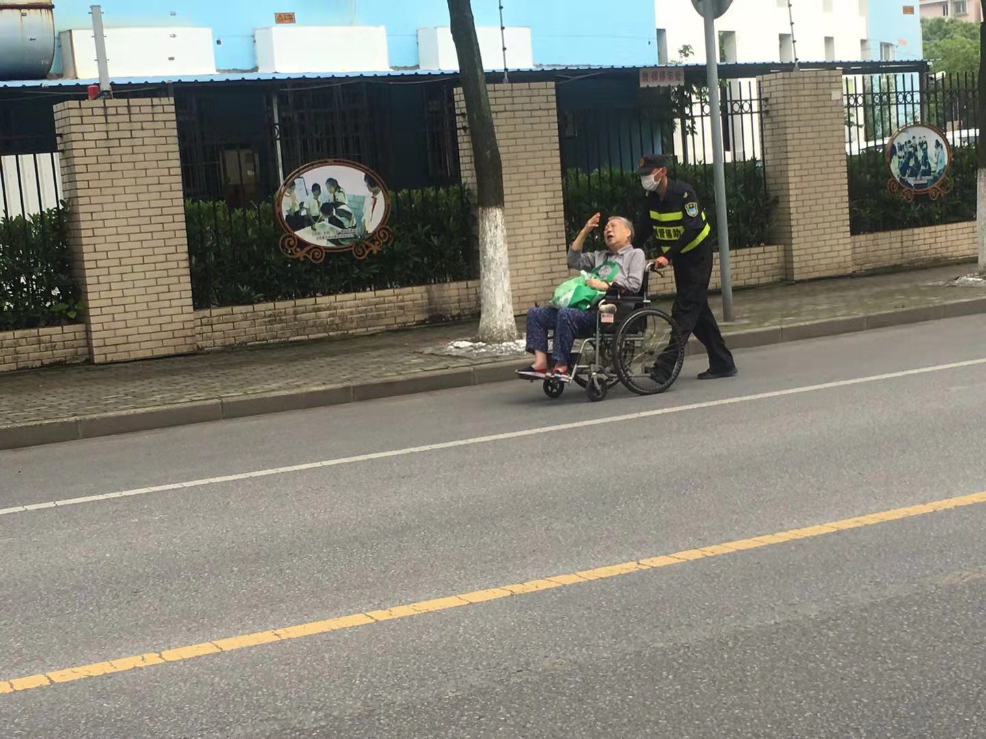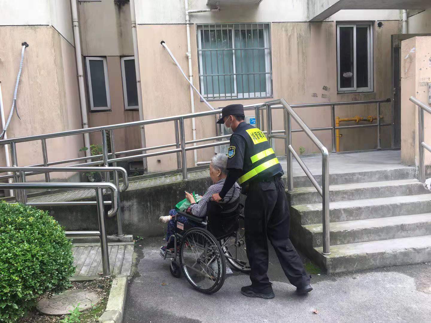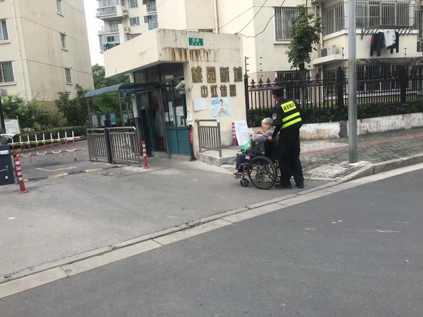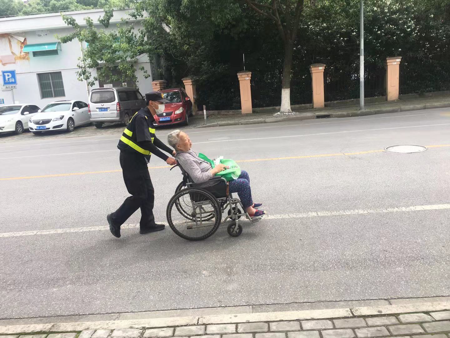 6月8日,宗保公司驻周浦市容项目队员张柯旋,巡逻至瑞阳路331号时,发现一名坐着轮椅的老人横在马路中间。马路上车来车往,没有车辆主动避让,老人的处境非常危险。