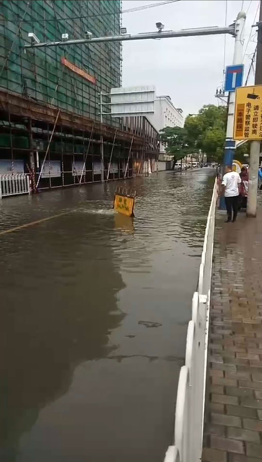 6月5日,闵行区虹梅南路莘朱路路口,由于突降暴雨,下水道堵塞路面积水,严重影响道路交通安全。