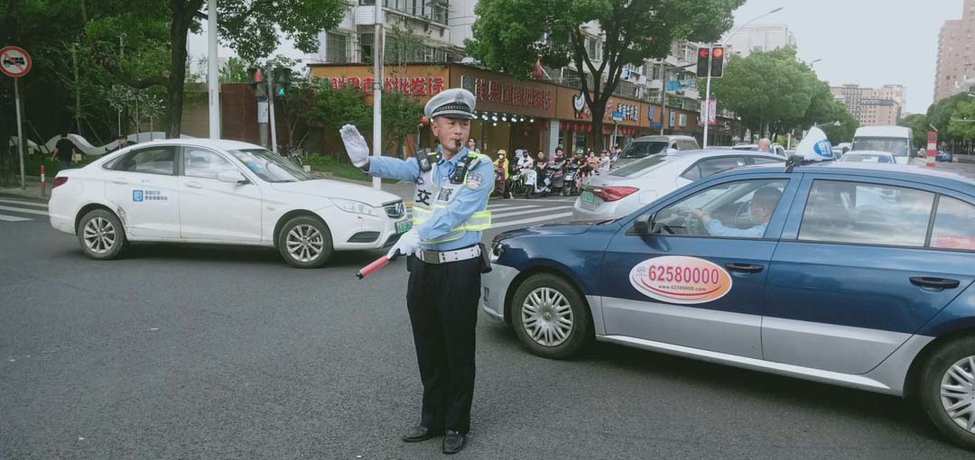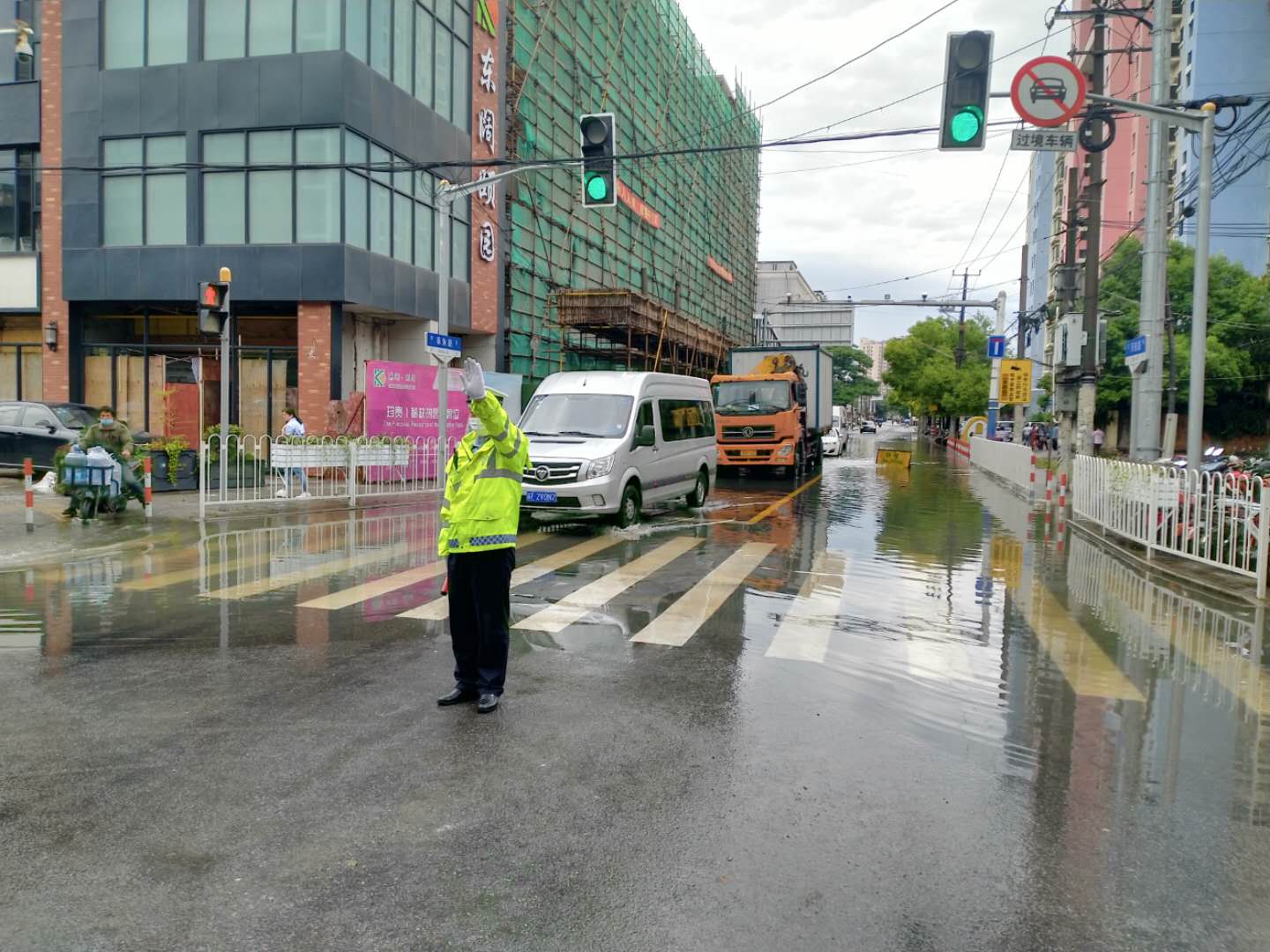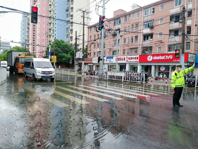 宗保公司驻莘庄梅陇交通辅警项目队员李晓龙,暴雨中坚守岗位,不顾雨水浇身,配合交警镇定指挥,疏导交通排堵保畅,及时引导车辆避免驶入积水路段,确保了道路交通安全。