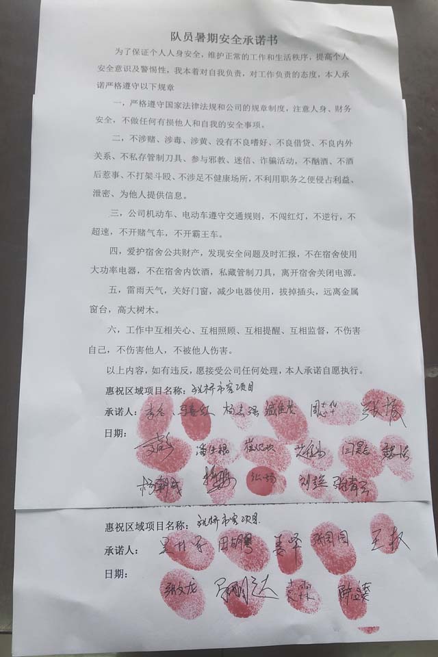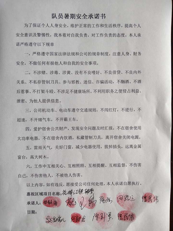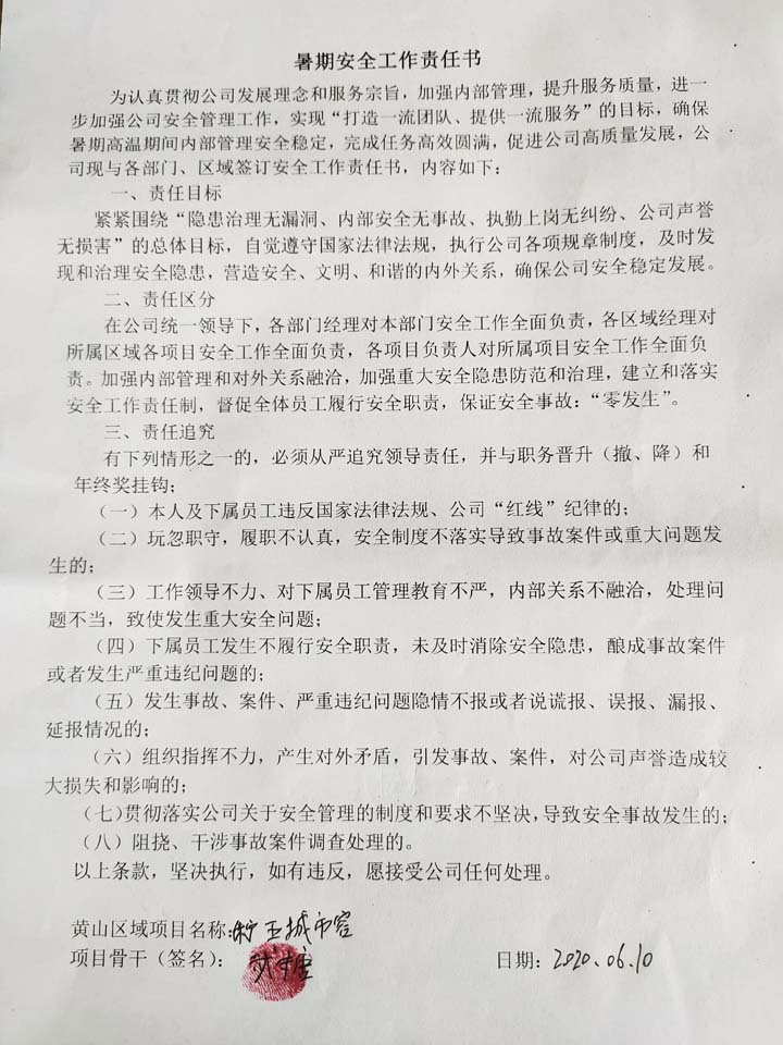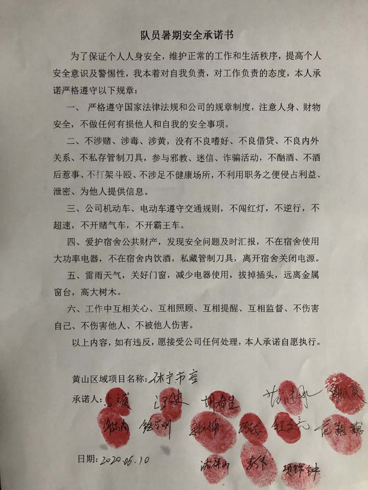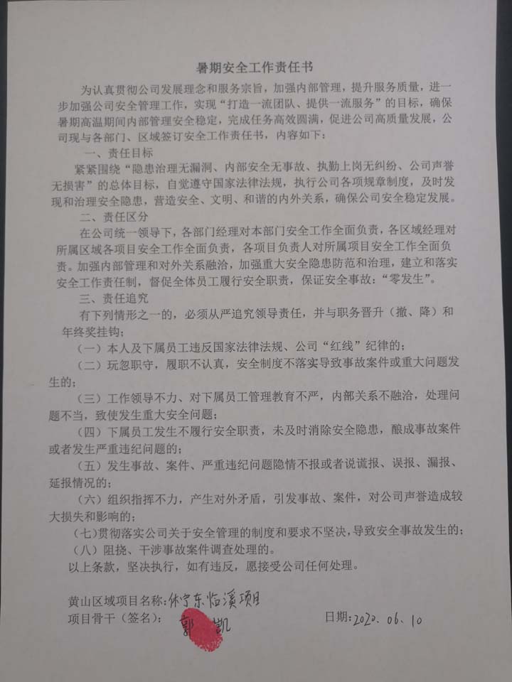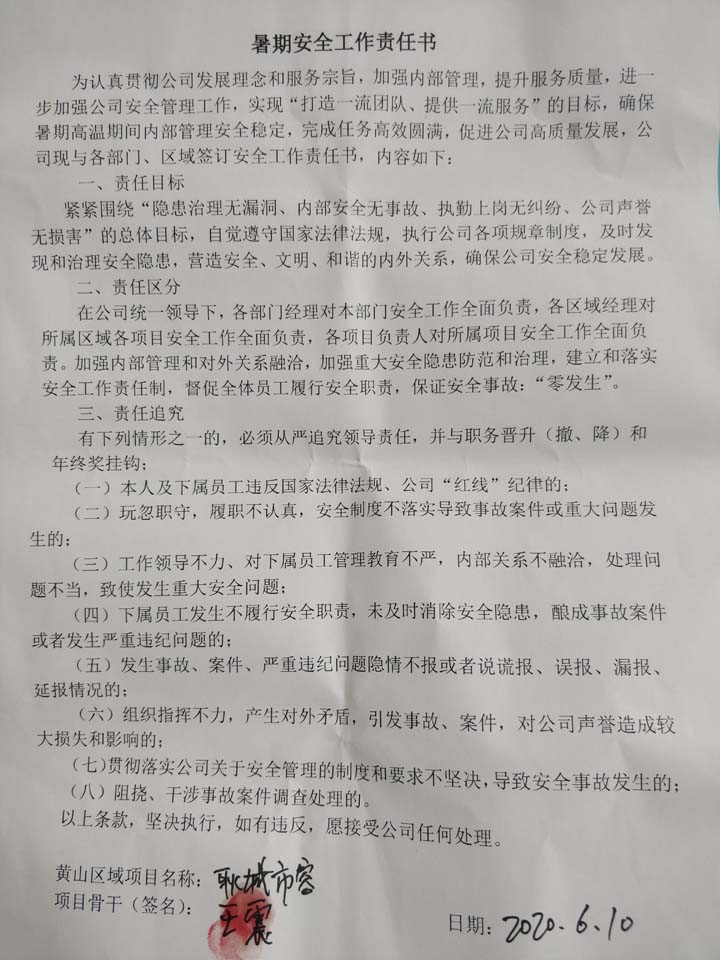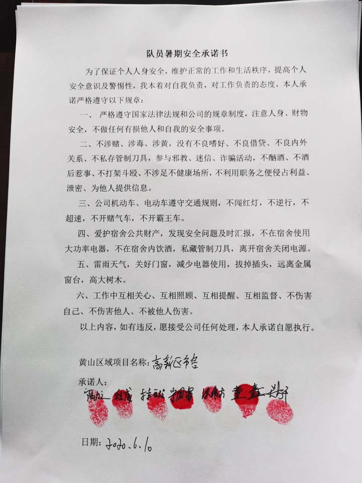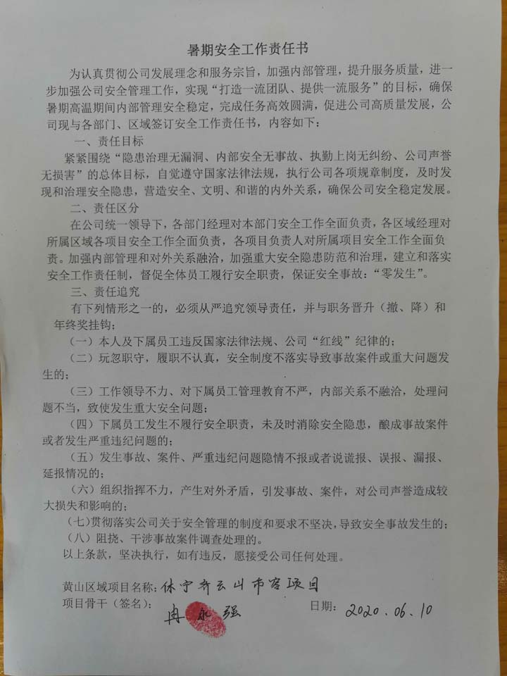 全体员工认真学习领会公司暑期安全工作部署会精神,思想上高度重视,行动上坚定自觉,各项目骨干带头与队员签订暑期安全承诺书,强化责任意识,筑牢安全防线,坚守安全底线,确保平稳度夏。