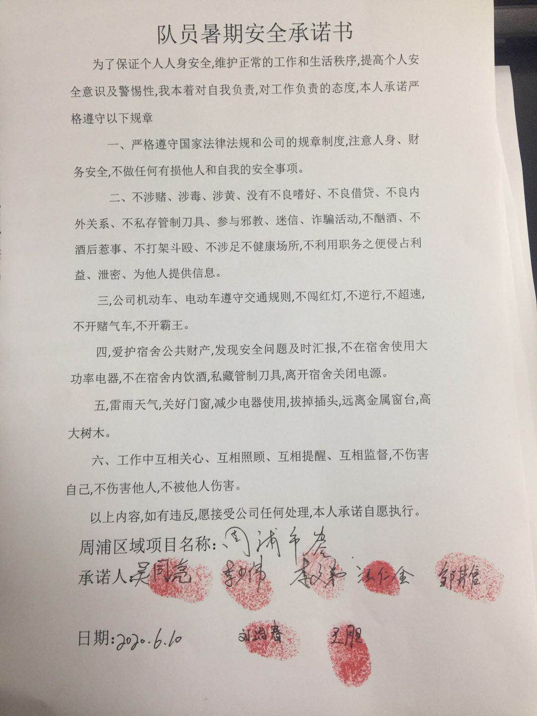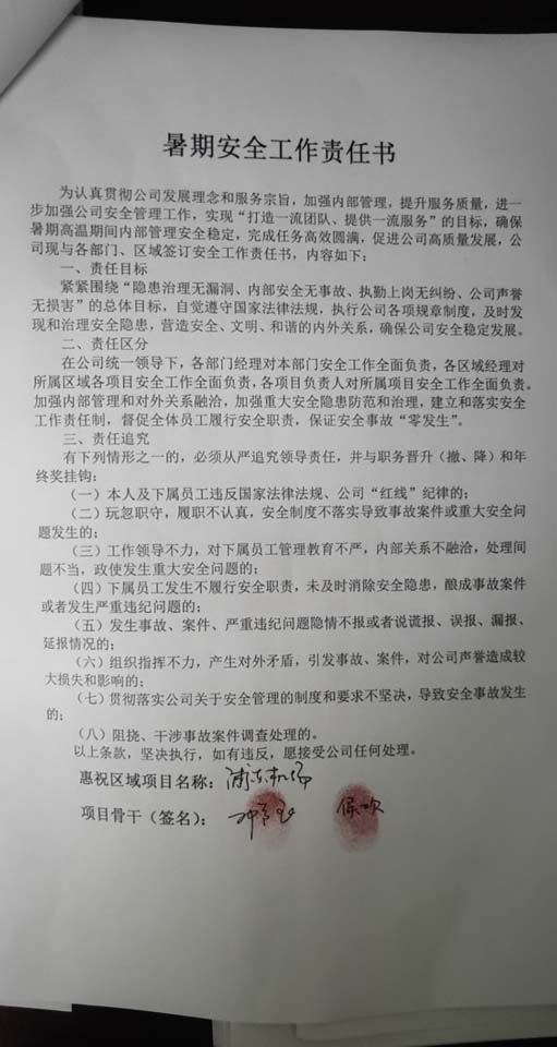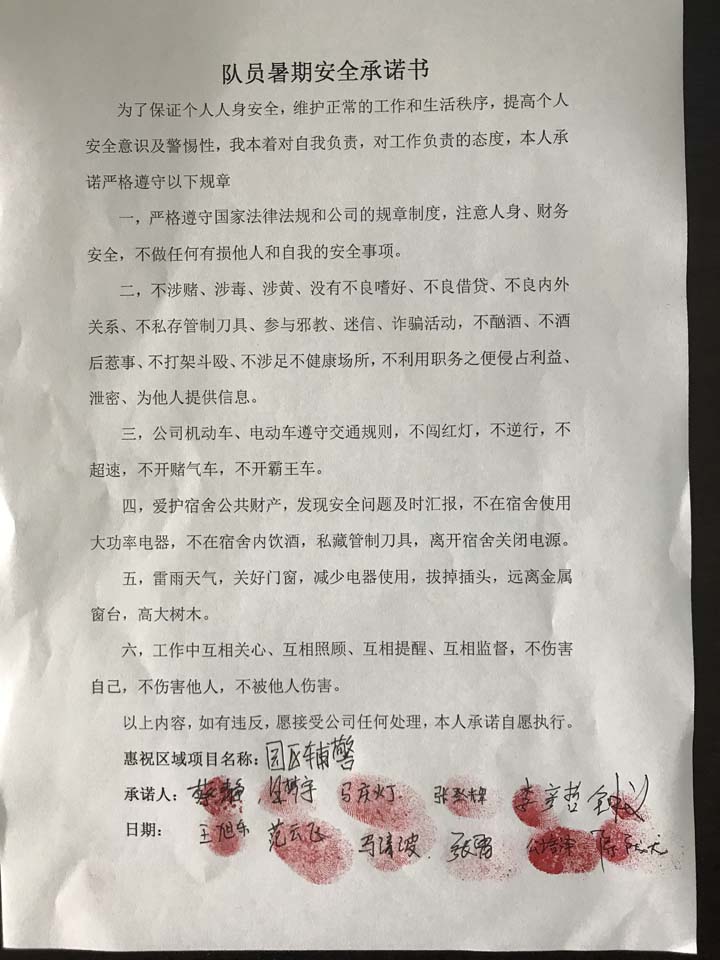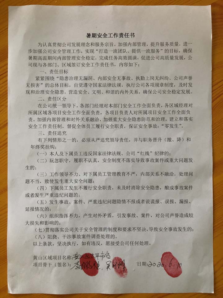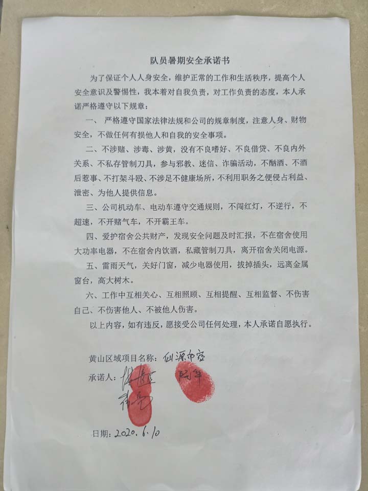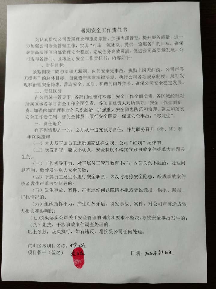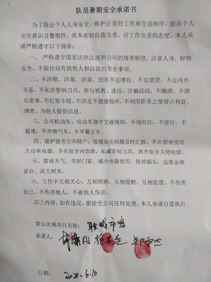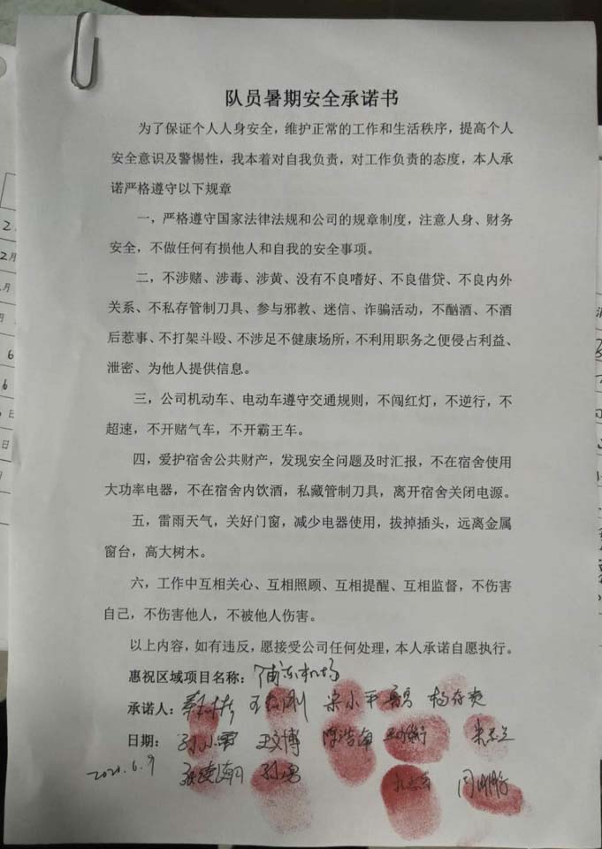 全体员工认真学习领会公司暑期安全工作部署会精神,思想上高度重视,行动上坚定自觉,各项目骨干带头与队员签订暑期安全承诺书,强化责任意识,筑牢安全防线,坚守安全底线,确保平稳度夏。