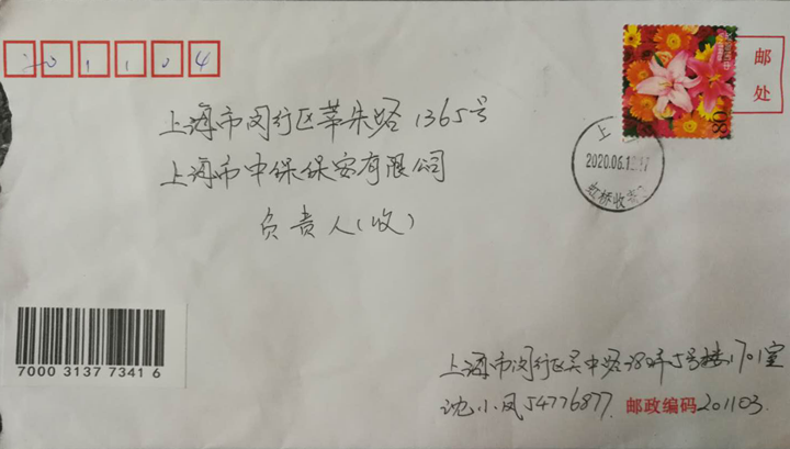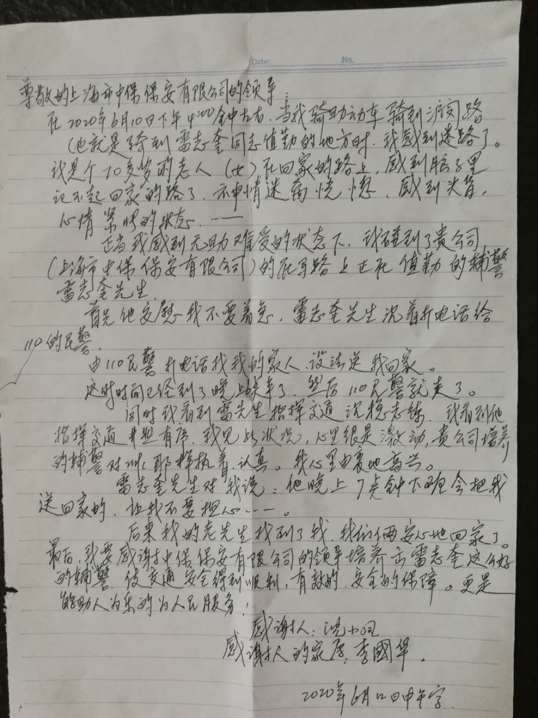 6月12日,宗保公司驻闵行莘庄梅陇交通辅警项目队员雷志奎收到市民沈小凤老人家属寄来的一封感谢信。