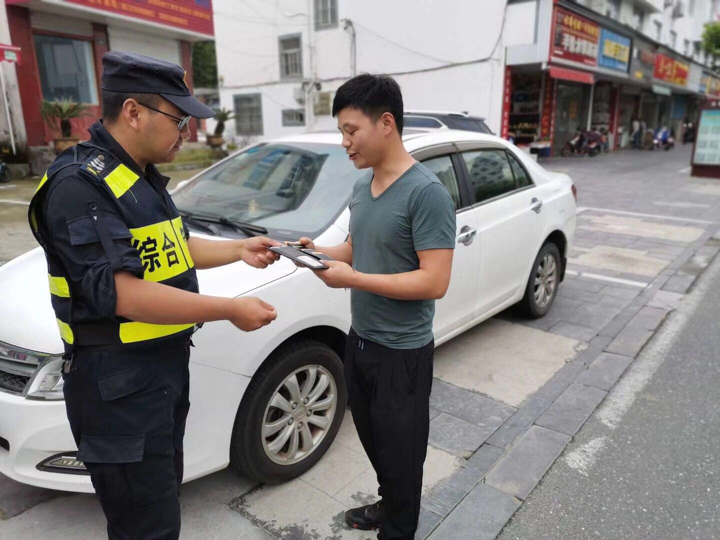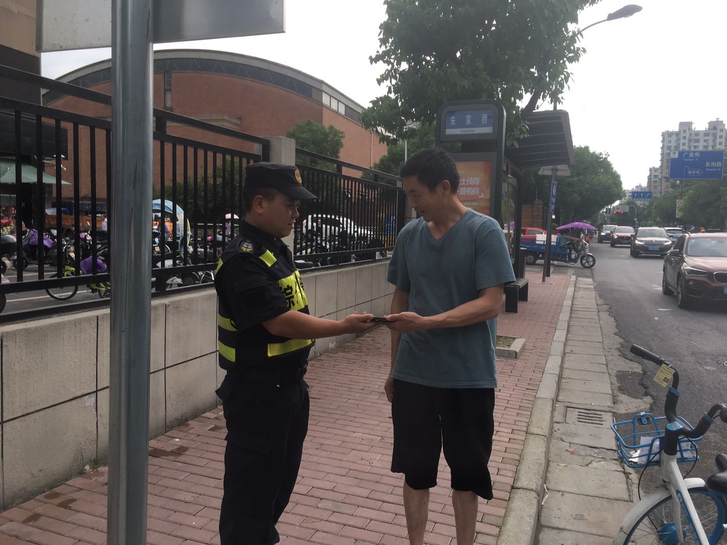 20分钟后,一位中年妇女急匆匆地走来,像是在寻找东西。两位队员上前询问,经核对身份信息,这位大姐正是手机的失主。路边乘凉的大爷看到这一幕,竖起大拇指为两位队员点赞。