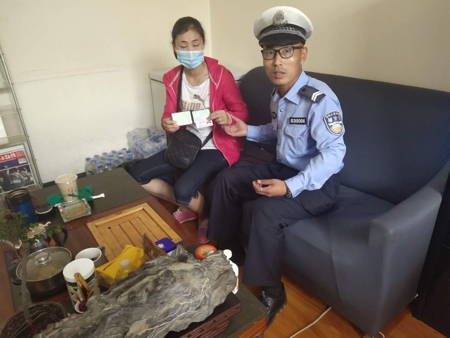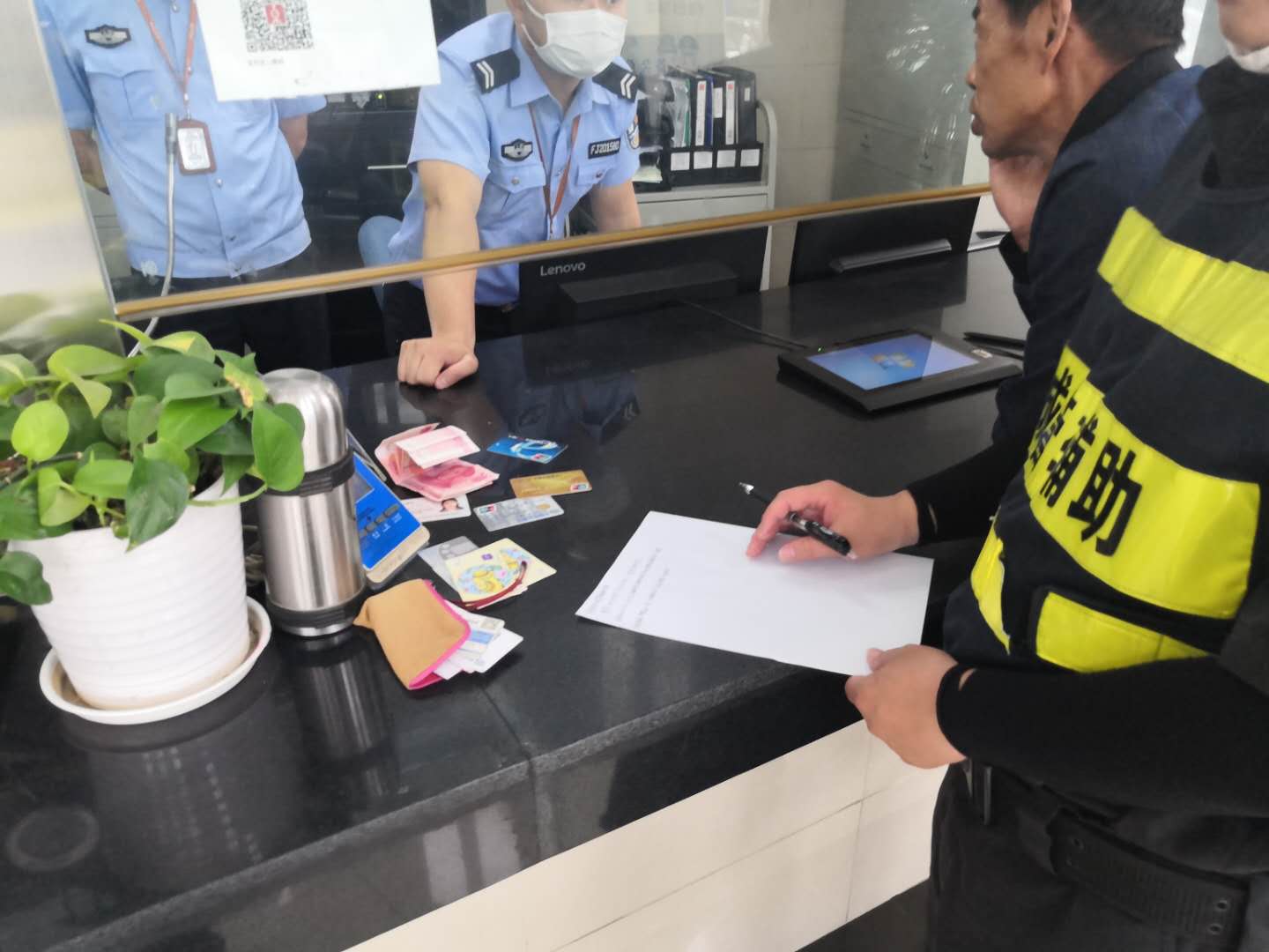 周东派出所民警根据证件上的信息,联系失主前来认领,值班民警对宗保队员这种拾金不昧的行为给予肯定和赞扬。