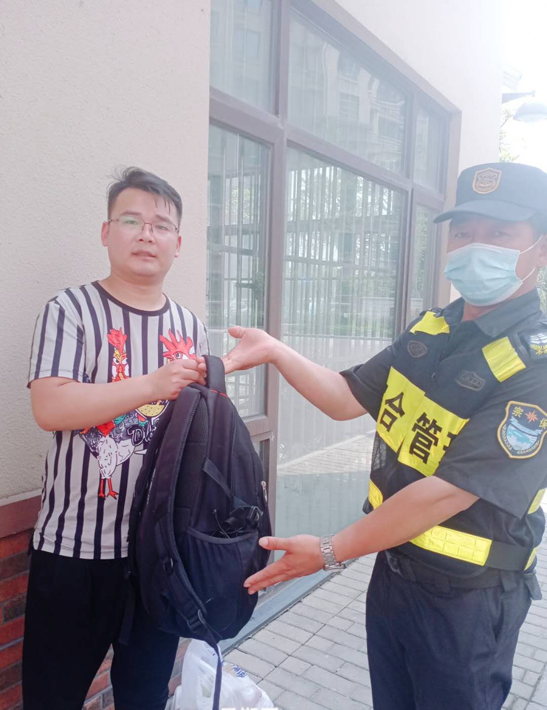 宗保公司驻长兴岛市容项目队员捡到双肩包