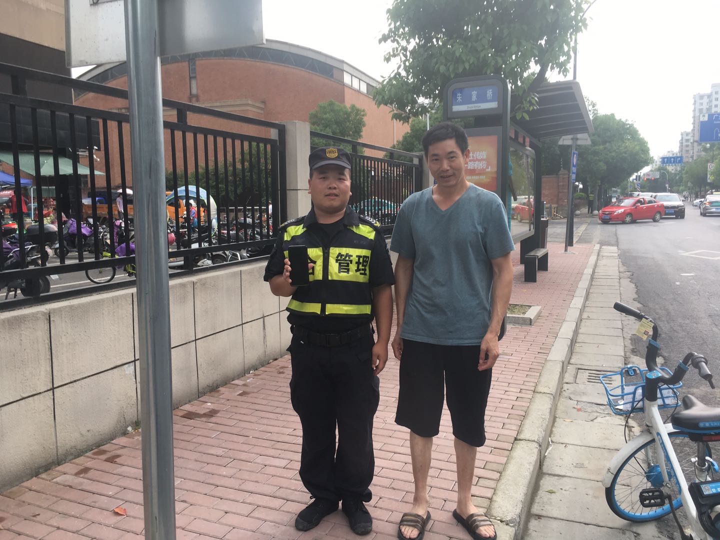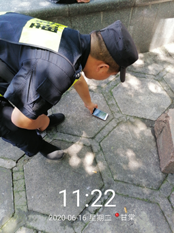 6月14号14:55,浙江民泰驻金家渡菜场综合管理队员郭勇强在朱家路巡逻时捡到一部手机,询问周边商户无果。小郭将此事汇报给带班组长,得到指令原地等待失主。
