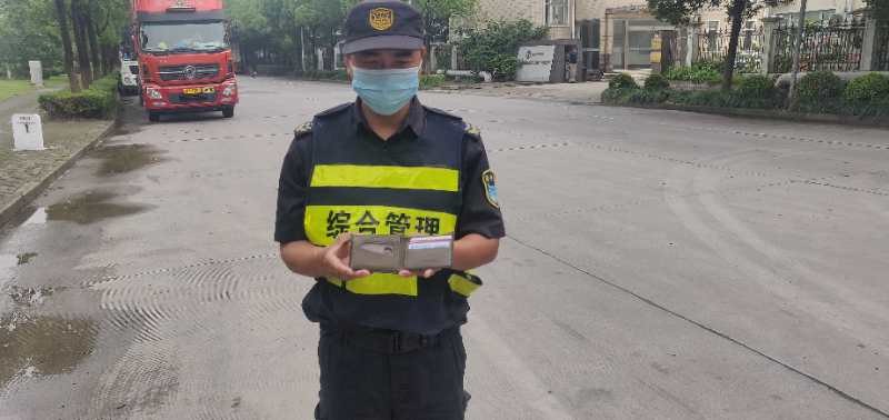 6月24日6:30,宗保公司驻高行市容项目驾驶员崔雷雷巡查至衡安路598号附近时,发现马路边有一黑色钱包。小崔停好车捡起钱包,内装有少量现金、身份证、银行卡、各类证卡、行程单据等。清点钱包内物品时,小崔打开执法记录仪进行了全程记录。