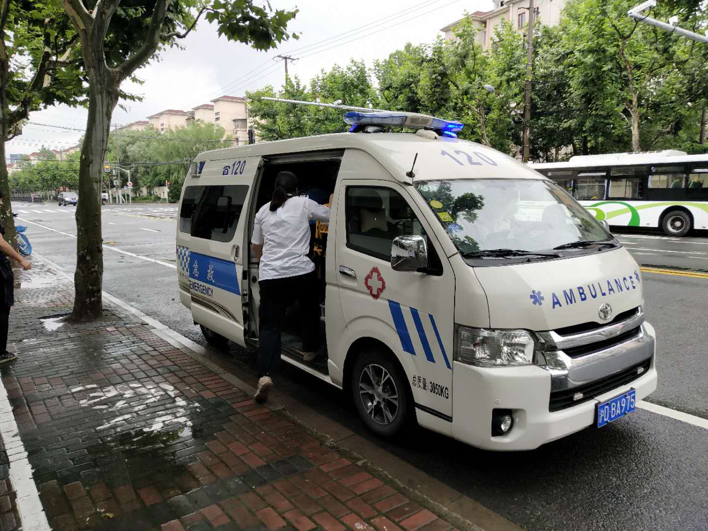 民警和120医护人员前后到达现场,刘志龙协助医护人员将外卖小哥送上救护车去医院紧急救治。