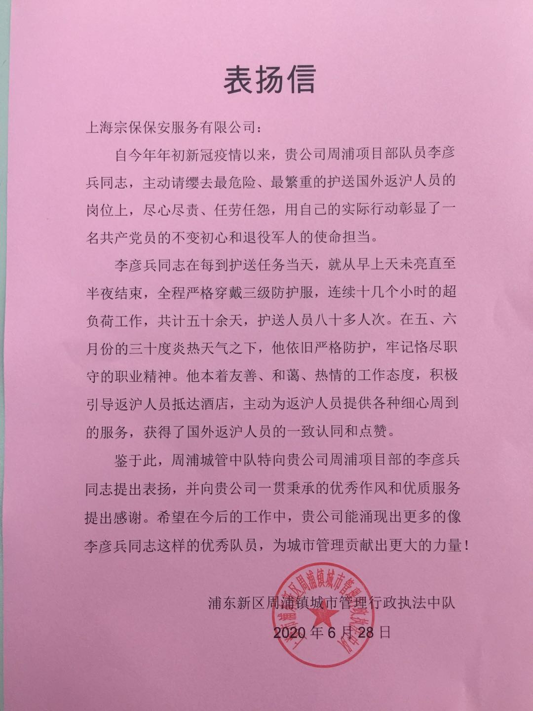 6月28日,宗保公司驻周浦市容项目收到周浦镇城市管理行政执法中队送来的一封表扬信,信中对周浦市容项目队员李彦兵提出表扬,并对宗保公司提供的优质服务和队员展现的优良作风表示感谢。