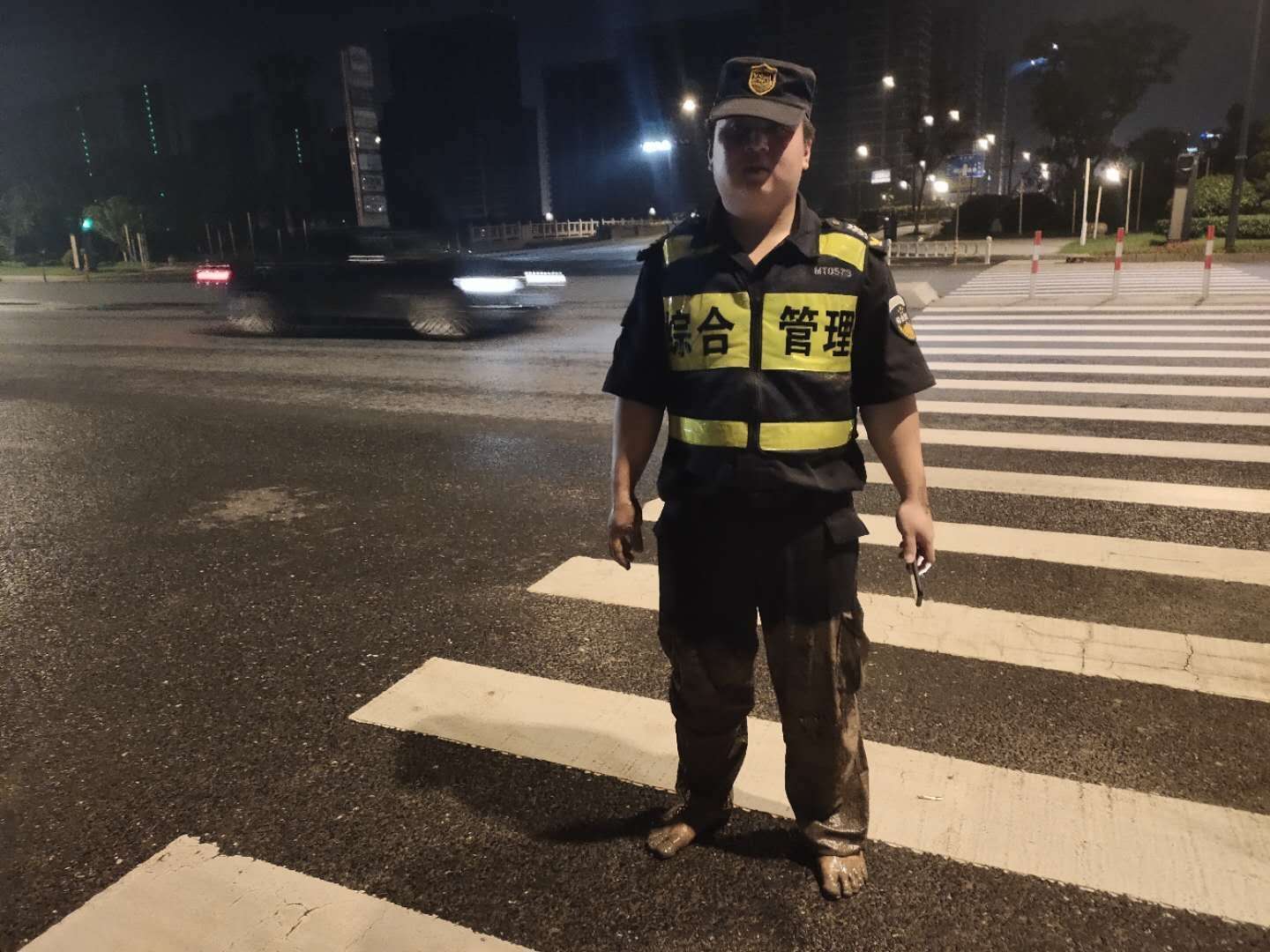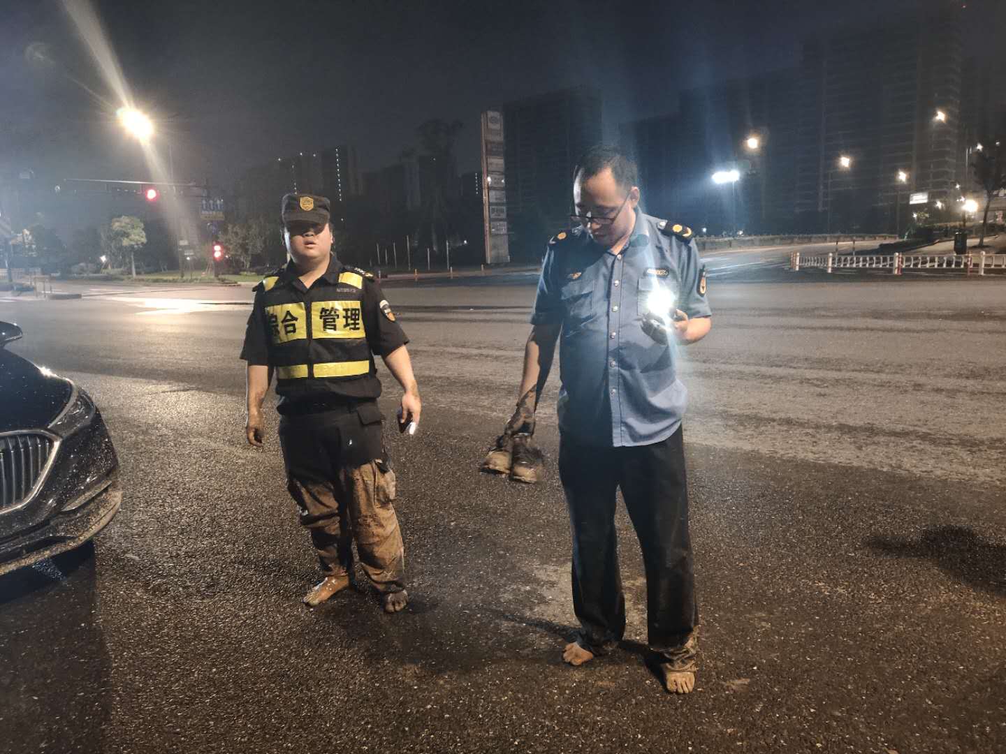 当天凌晨1点,该项目夜班队员温东兴、蒋超、王园召在巡查期间接到举报电话,有人在附近路边倾倒工程渣土。三人立即将此事汇报城管中队领导,在相关领导的带领下随即赶赴事发现场,发现当事人正准备驾车逃离。由于近期雨水多,路面严重泥泞,违规渣土车行驶缓慢。三名队员立刻下车,不顾泥泞,不管满身泥浆,鞋子陷入泥中就赤脚,深一脚浅一脚地奋力追赶,最终在三人的努力下,成功地将涉事人员和车辆控制。