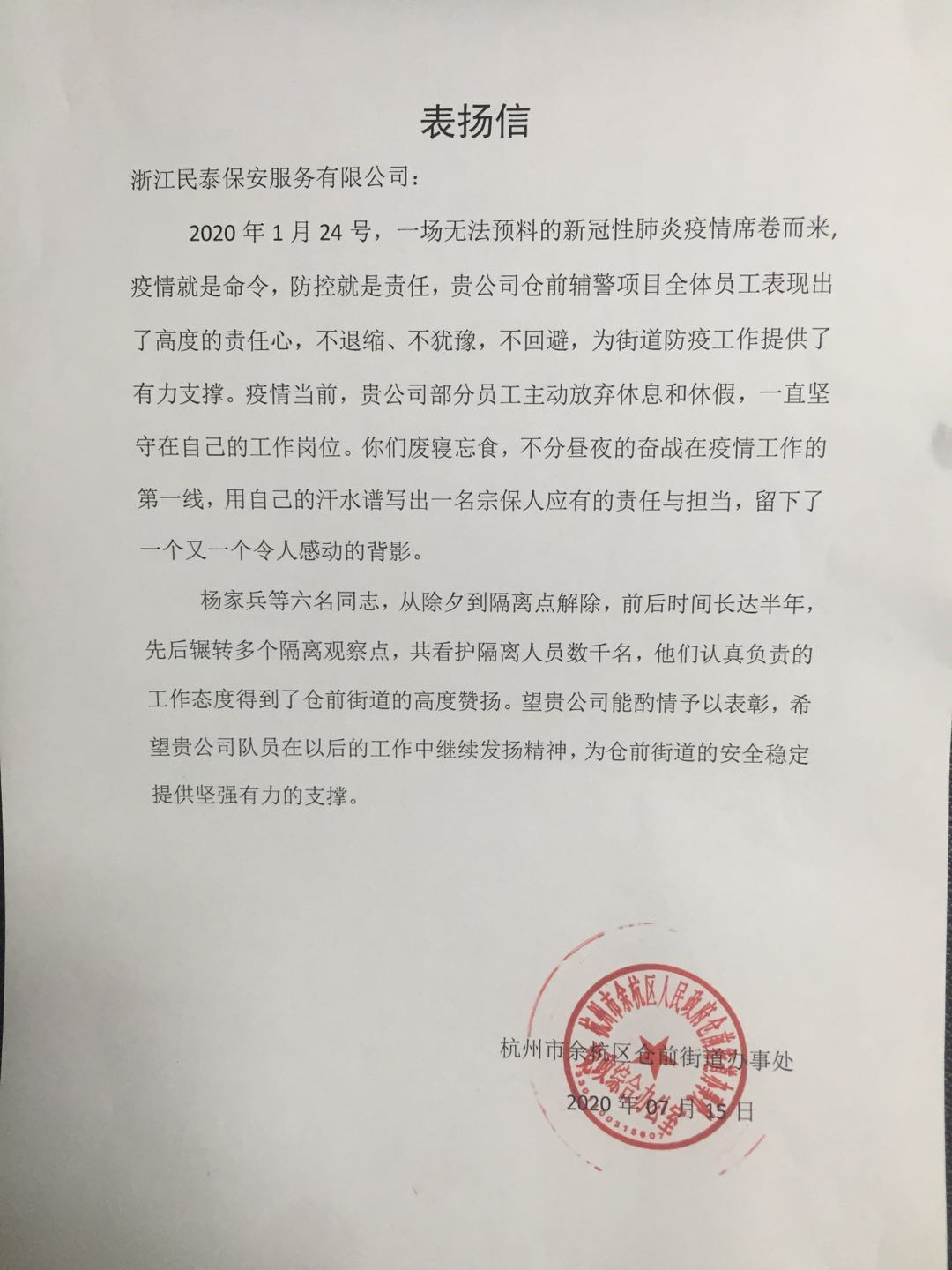 7月15日,浙江民泰驻仓前派出所辅警项目收到一封来自余杭区仓前街道办事处的表扬信,信中对在疫情防控期间,为仓前街道防疫工作提供有力支撑的仓前派出所辅警项目提出表扬。