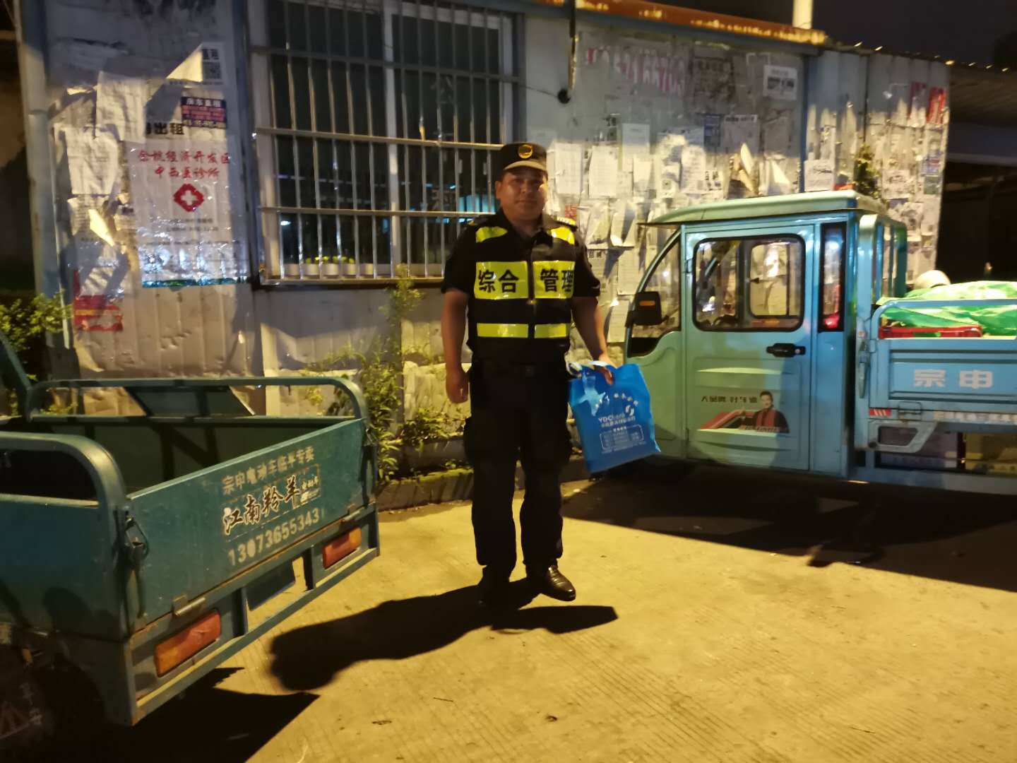 7月13日19:30,浙江民泰公司驻东湖市容项目队员张艮振巡逻途经章家河农贸市场时,发现地上有一个快递包裹,通过上面收件人的联系方式,张艮振和包裹主人取得了联系,并约定好在民泰公司基地办公室领取。