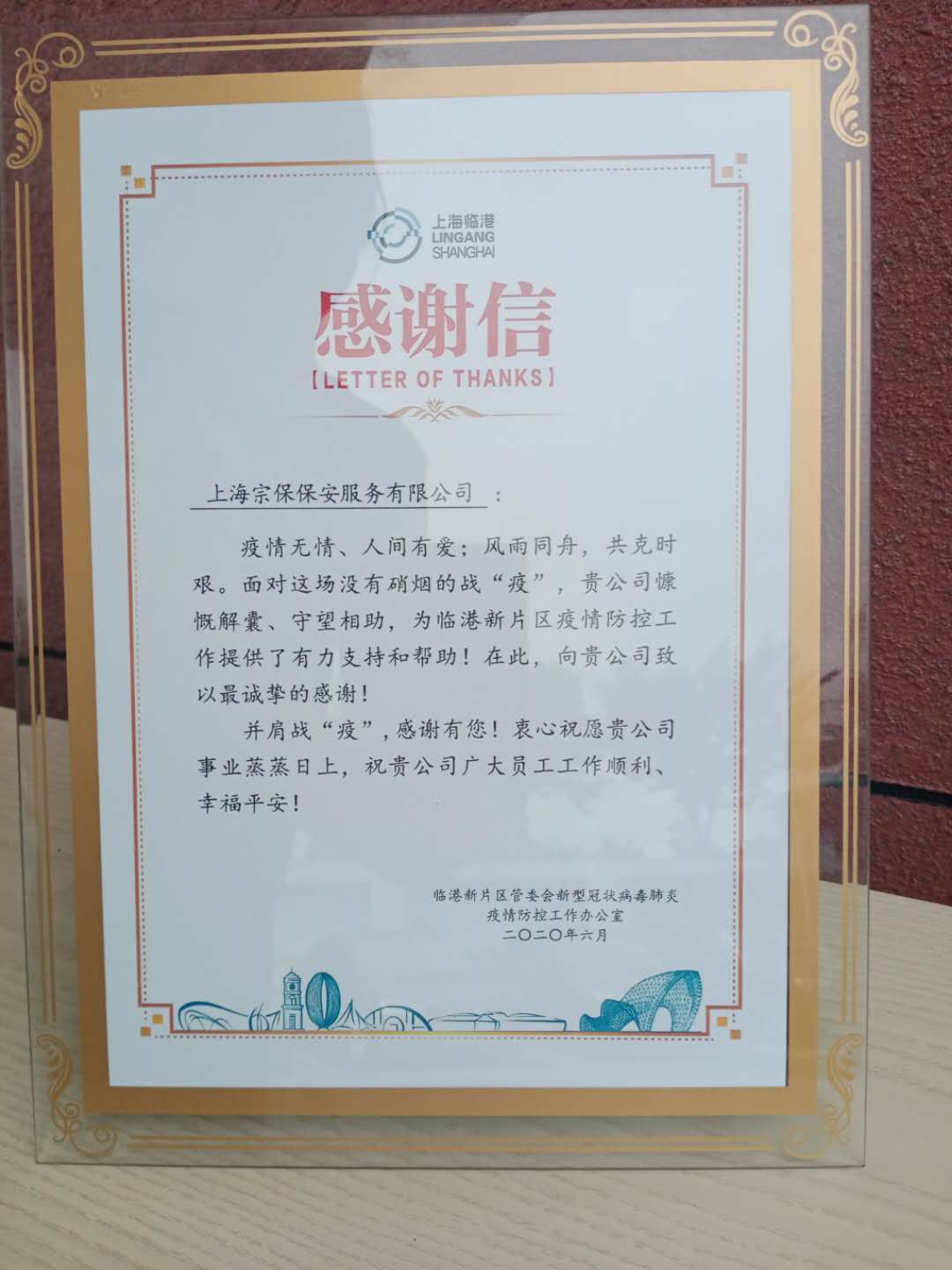 2020年6月份,上海宗保保安服务有限公司收到一封临港新片区管委会新型冠状病毒肺炎疫情防控工作办公室的表扬信,信中对公司大力支持临港新片区管委会疫情防控工作表示感谢。