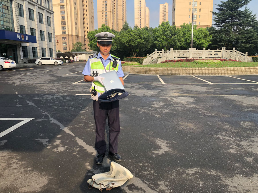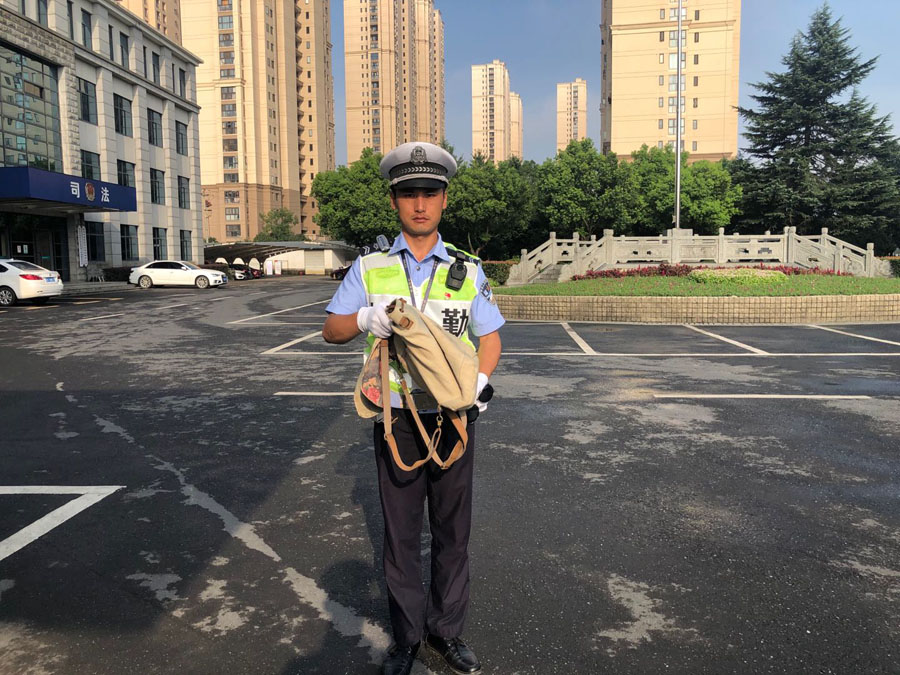 7月22日7:10,浙江民泰驻闲林交通辅警项目队员张龙、李丹两人在02省道闲富路北口站高峰岗执勤时,发现一辆由西向东直行的电动车后座掉落一个米色背包。张龙赶紧呼叫车主,可是车主未能听见,继续向前行驶。