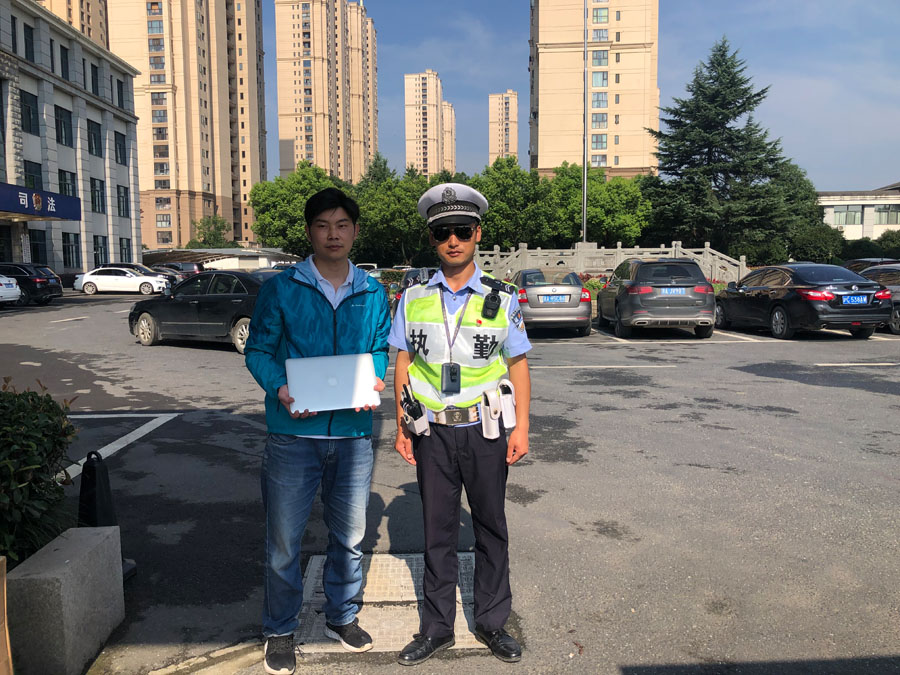于是,张龙把背包就近放置在闲林街道办事处保安室门卫处,并向工作人员说明情况,然后继续执勤等待失主回来找寻。大概在8:30早高峰即将换岗的时候,一位穿蓝色外套的男士急匆匆地赶过来,询问张龙和李丹是否捡到一个装有苹果电脑的包。张龙将失主带到门卫处认领,经核对穿蓝色外套的男士确实是失主本人后,就把包内电脑及其他贵重物品原封不动地交还了失主。