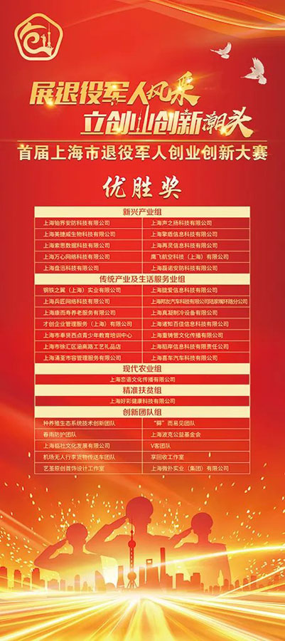 7月28日,首届上海市退役军人创业创新大赛颁奖典礼在浦东新区张江人工智能馆举办。宗保公司旗下的鹰飞航空科技(上海)有限公司荣获优胜奖。