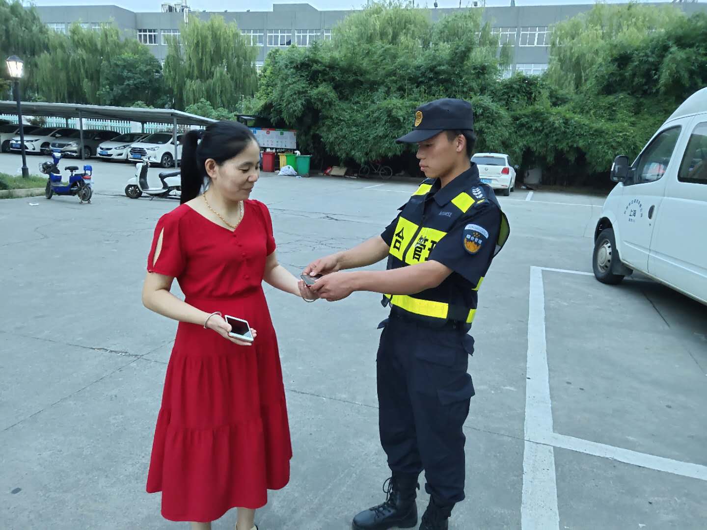 7月23日17点45,东湖街道项目二中队队员陈强军,在塘宁路老板电器正门西北角50米处日常巡查中,捡到一部红色OPPO手机。陈强军立即查看四周,但未能找到失主。 于是,陈强军将情况上报组长李强。李强赶到现场后,两人在原地等了半个多小时,仍未见失主前来寻找。李强随即决定先把手机交由项目队长处理。 在回基地的途中,接到了失主打来的电话,李强表明身份后和失主约定在基地归还手机。过了十几分钟,失主急匆匆地赶到基地,李强核实失主身份后将手机归还,失主表示十分感谢。
