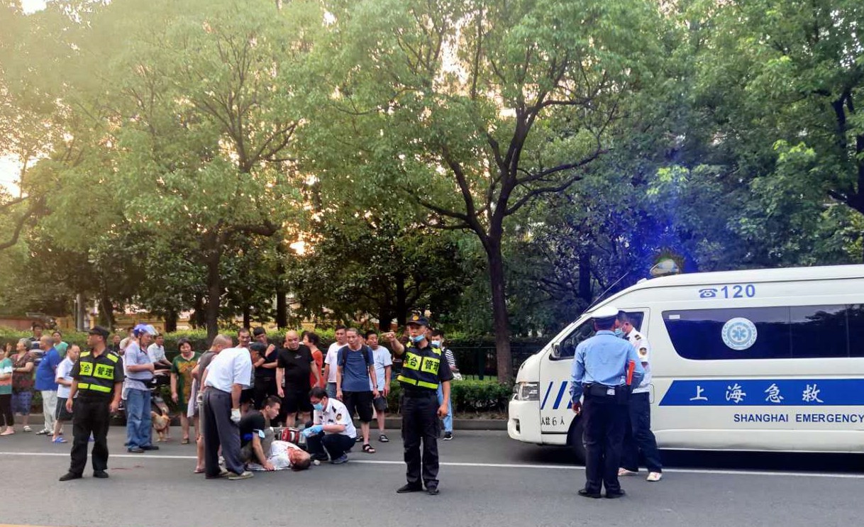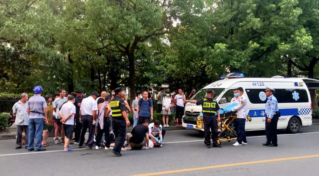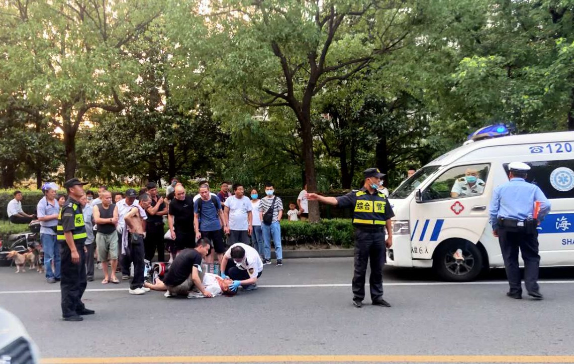 7月24日18:30,宗保公司驻三林市容项目队员张治付等三名队员巡逻至杨思地铁1号口东30米时,遇到一起突发的交通事故。