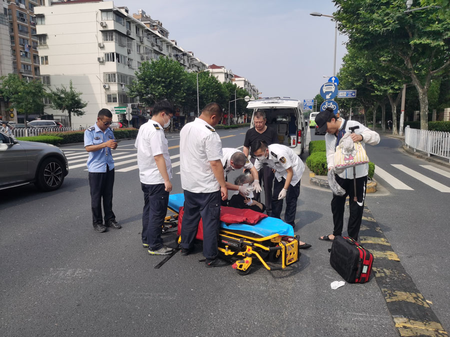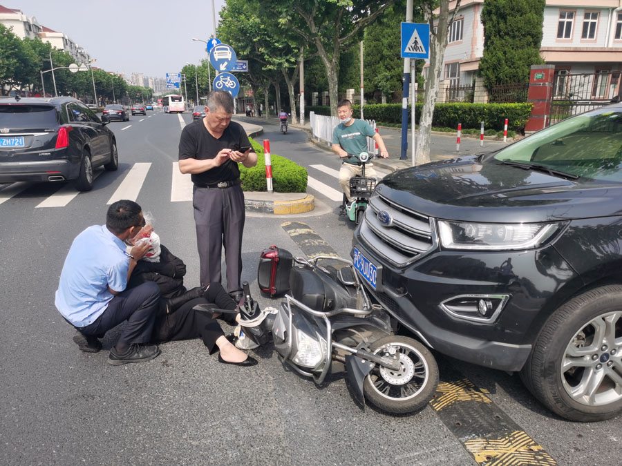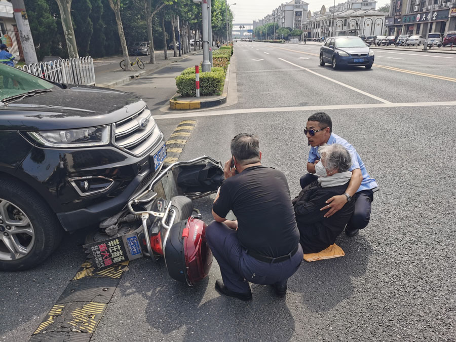7月22日14时,闵行莘庄梅陇交通辅警郑德坡和经理周鹍经过春莘路时,发现路边发生一起交通事故。机动车与非机动车相撞,被撞的老人坐在地上,满脸是血。两人见状迅速调转车头,将车在路边停好后,上前查看老人受伤情况,用手机拍摄现场照片,一同指挥车辆不要妨碍交通。